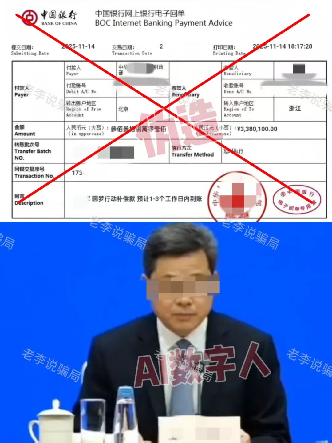冒充国家部门,利用AI数字人冒充公职人员,每日进行线上直播为参与者“洗脑”。以“338万补偿款”为诱饵,诱导参与者填写个人信息领取120万补偿款,缴纳310元“圆梦大使”还可再领取120万奖金。下载提示未备案且携带病毒。