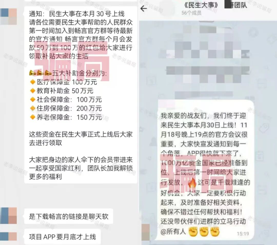 冒充国家部门,谎称为参与者发放500-600万资助款,吸引用户下载“畅言”,非法套取个人信息。