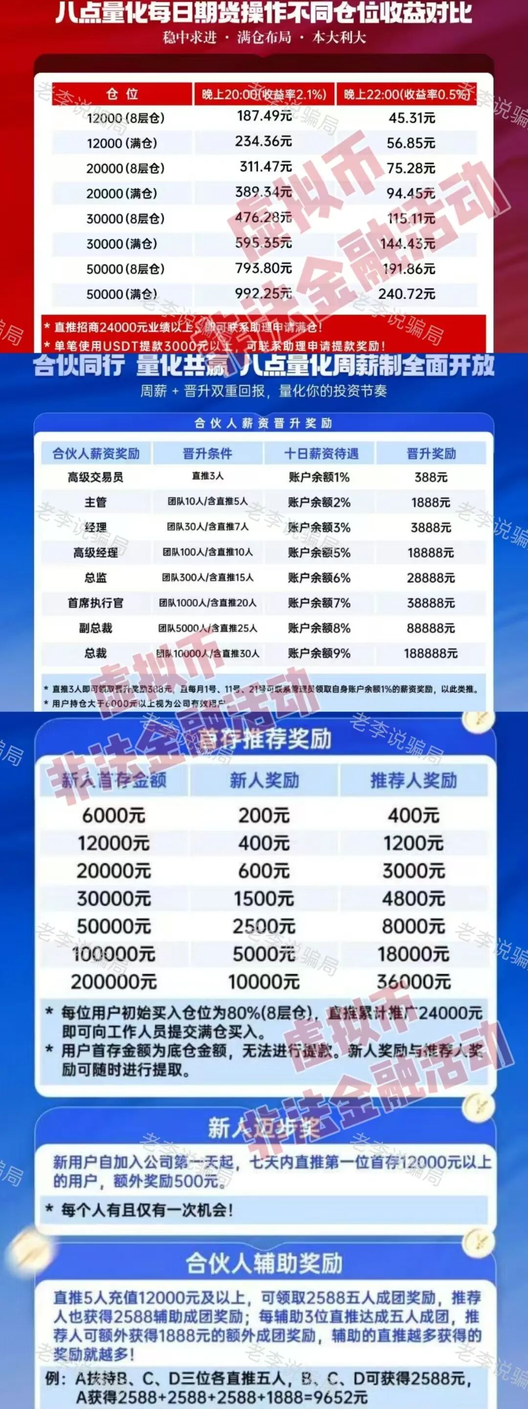 打着“期货合约智能跟单”的旗号,用户投资跟随所谓的“专家”购买期货,根据仓位获得对应的固定收益。稍有金融常识的人都知道,正规期货波动较大,无法保证稳赚不赔,收益率更是不可能固定。该项目承诺的固定收益又从何而来?