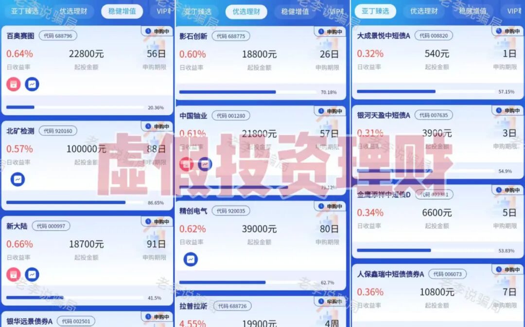 谎称“国家项目”发布虚假投资理财产品,以高额收益诱导用户投资。APP未备案,以动态IP规避打击。