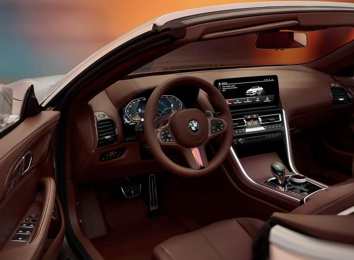 宝马Skytop座舱内部也延续了宝马M8的经典布局,配备了12.3英寸的全液晶仪表和10.25英寸的悬浮式中控液晶屏,带有M运动化主题模式。操控性方面,该车配备了宝马经典的三辐式多功能方向盘,操控岛区域加入了水晶切割工艺的“大鸡腿”换挡拨杆,旁边还有大尺寸的旋钮(驾驶模式切换),带来了更加熟悉的操控体验。车内采用了卢马棕色真皮材质,还加入了黑色钢琴烤漆装饰面板,银色金属饰条的点缀,车顶配备两个可手动拆卸的硬顶敞篷,可收纳在后备厢中。棕色皮革座椅与车辆整体色调和谐相融,晶莹剔透的内饰组件在驾驶舱中熠熠生辉,为出行增添一分明亮和点缀。