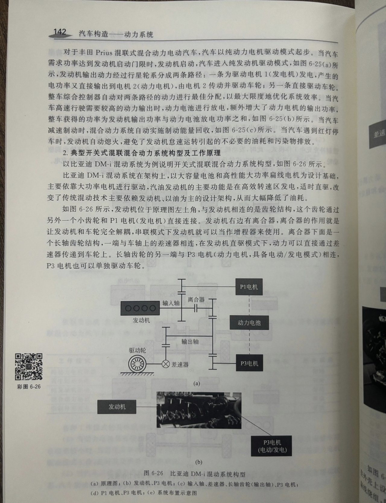 第二本教材是2025年版(也就是今年刚刚出版的)《汽车构造—动力系统》,封面内容是比亚迪第五代DM技术架构。该技术是比亚迪在2024年发布,在以电为主的基础上融入AI大模型和AI能耗管理策略,将百公里亏电油耗再降10%,做到了行业领先的2.9L,引领行业进入油耗2时代。