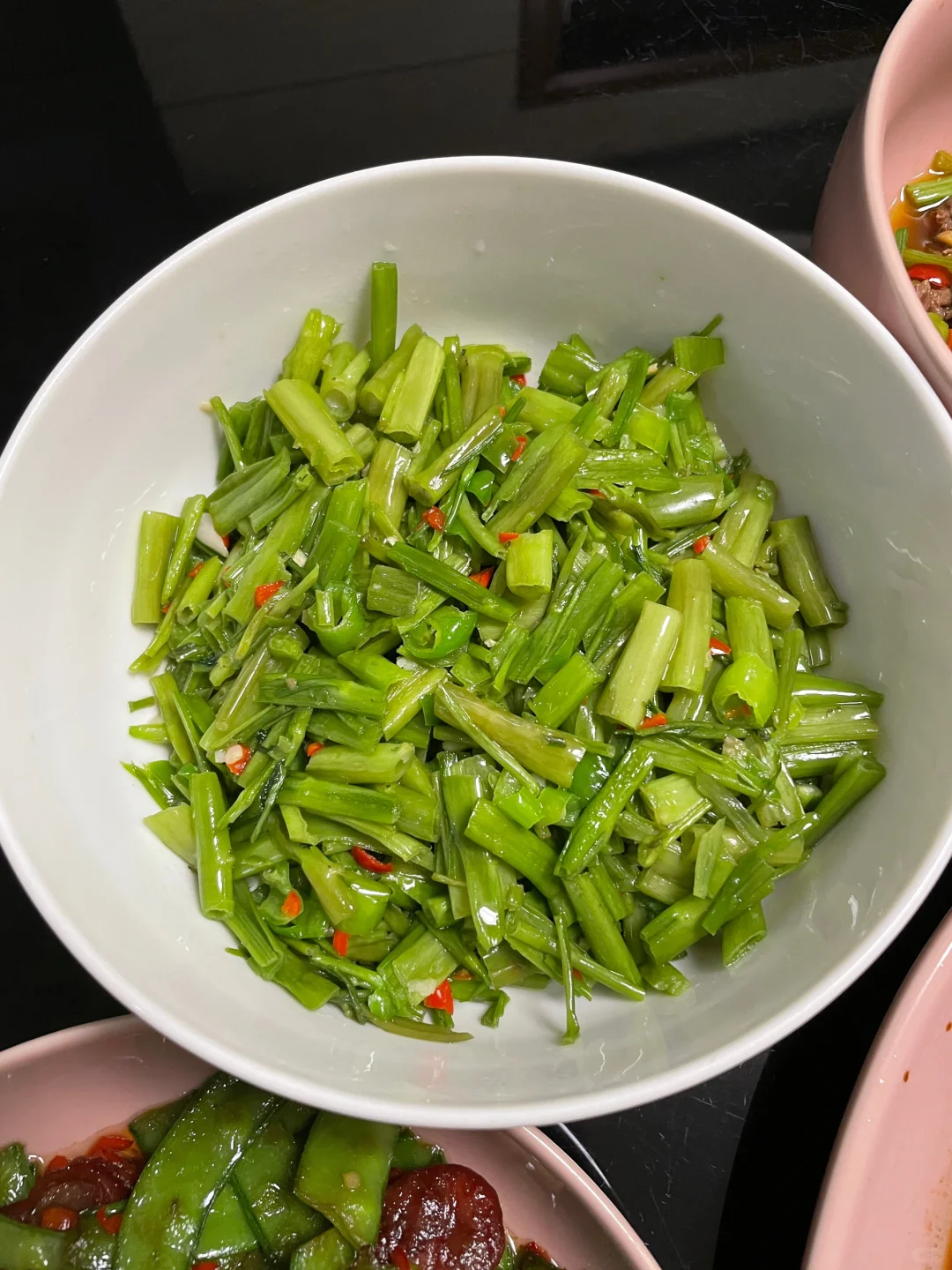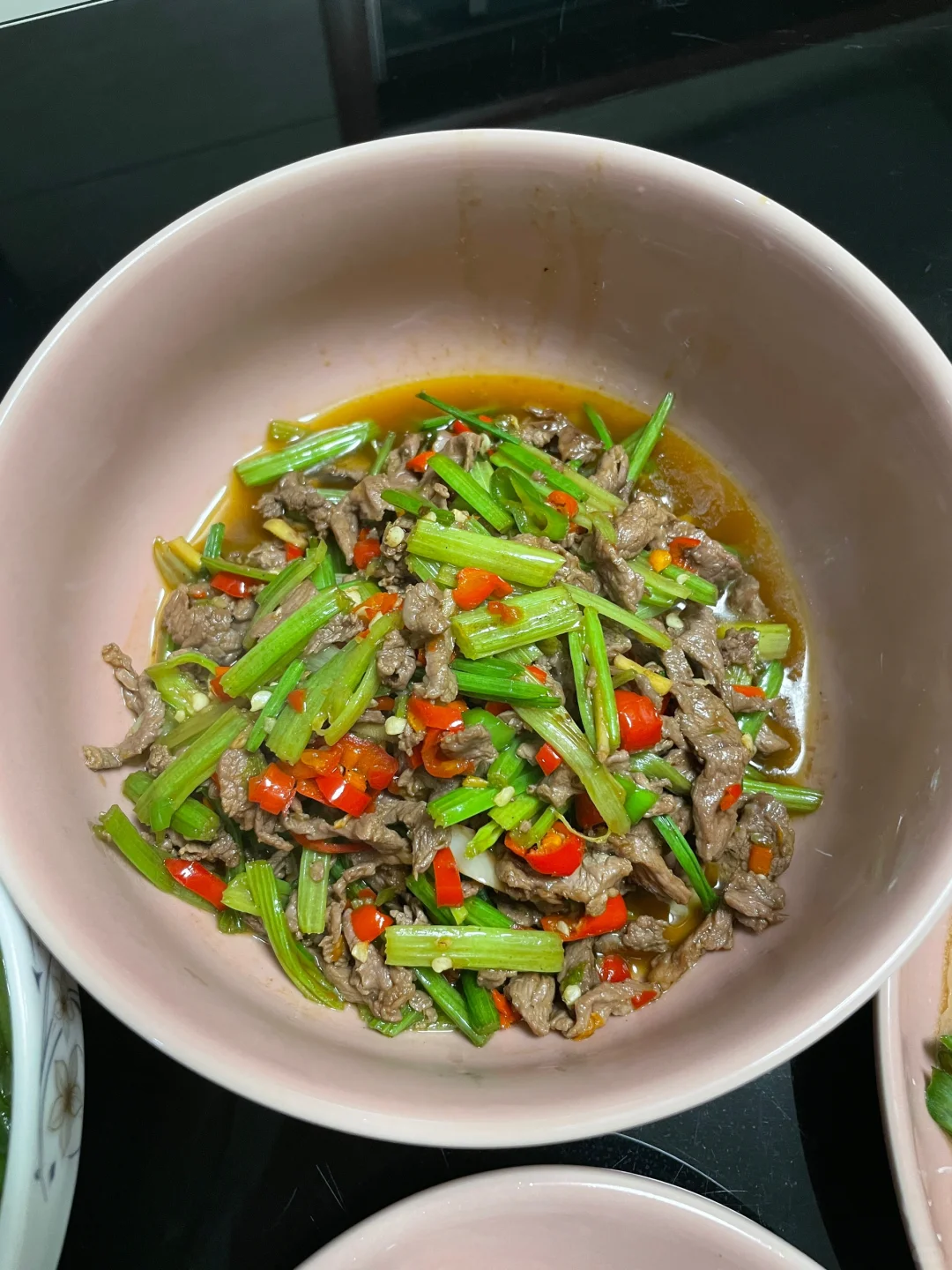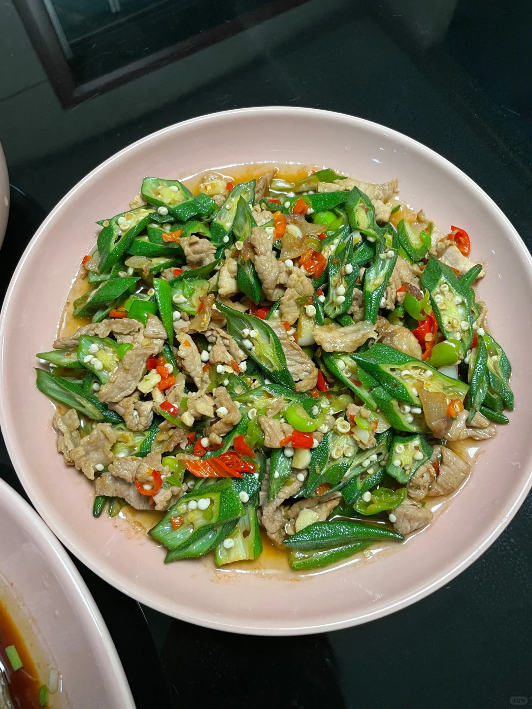 今日菜谱🥬 秋葵炒肉 芹菜炒牛肉 清炒空心菜梗 清蒸鲈鱼 荷兰豆炒香肠