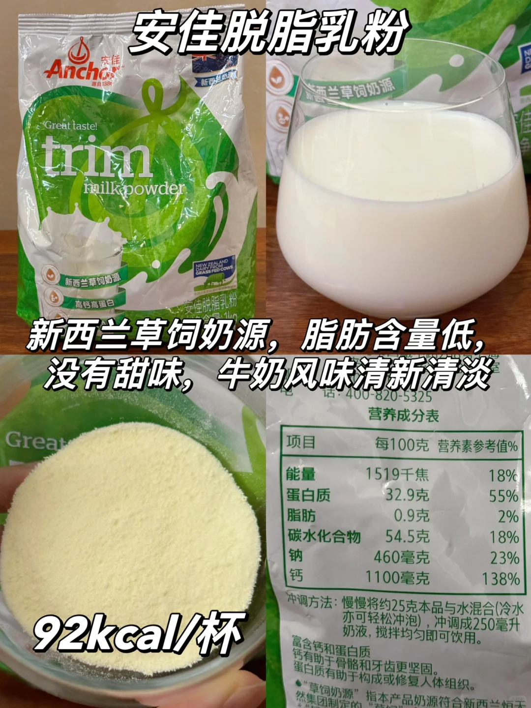 2️⃣ 安佳成人脱脂奶粉:新西兰草饲奶源,牛奶口感清淡很轻盈,脂肪含量最低!