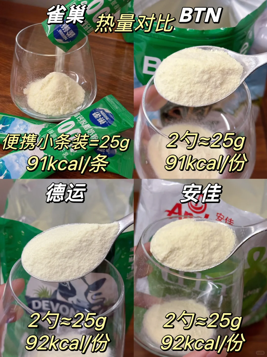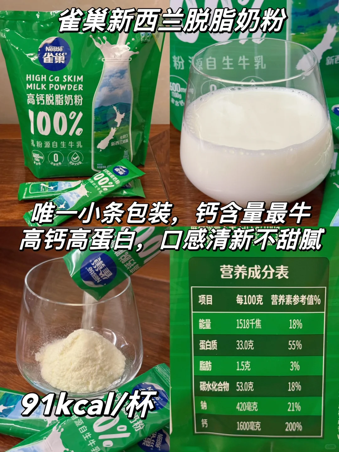 1️⃣雀巢新西兰脱脂奶粉:新西兰奶源,唯一小条包装,定量包装热量可控,钙含量最牛,0糖添加,口感上我也比较喜欢,奶味清新不甜腻!