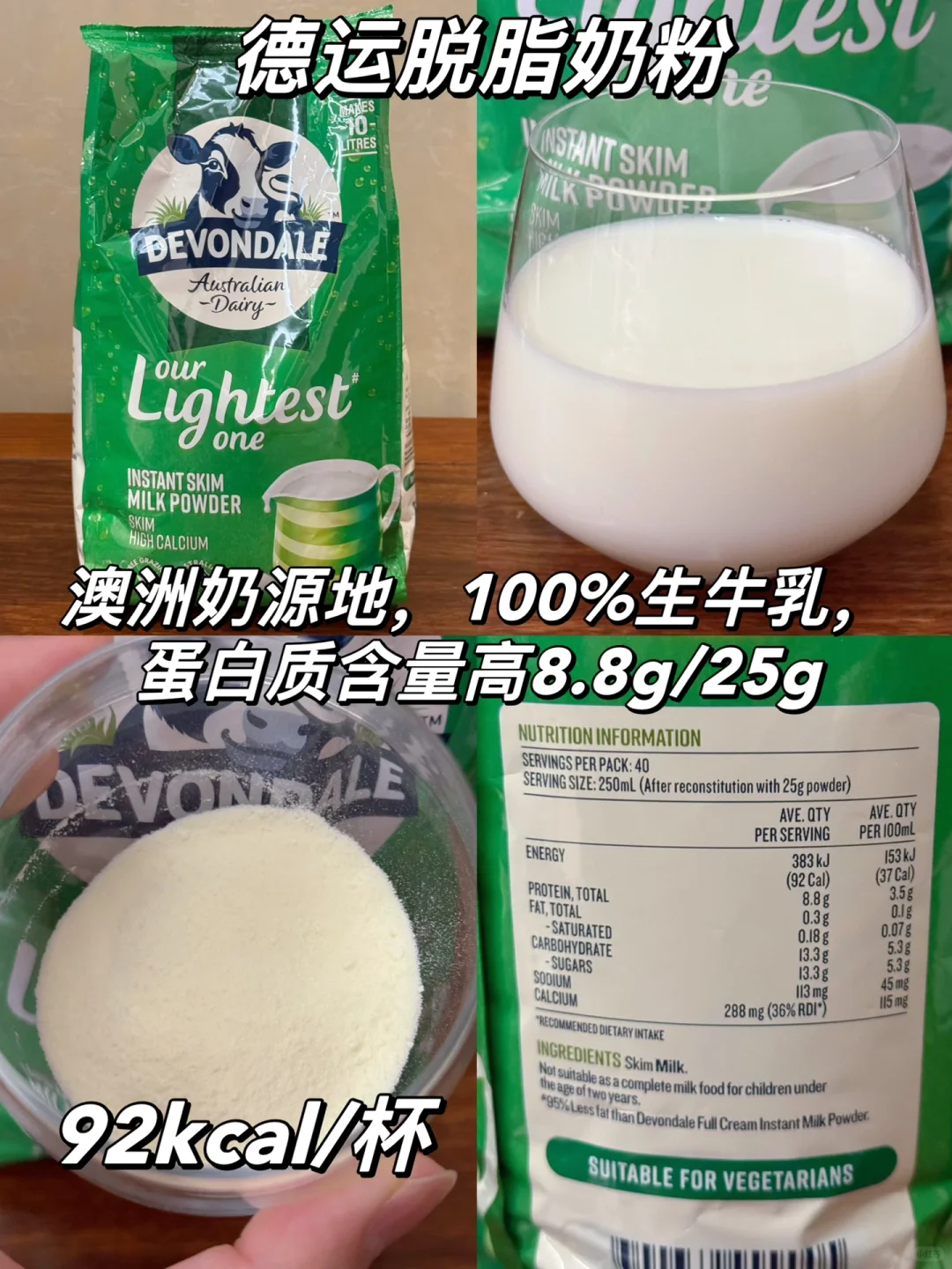 3️⃣德运澳洲脱脂奶粉:澳洲奶源地,100%生牛乳,蛋白质8.8g/每份含量最高!