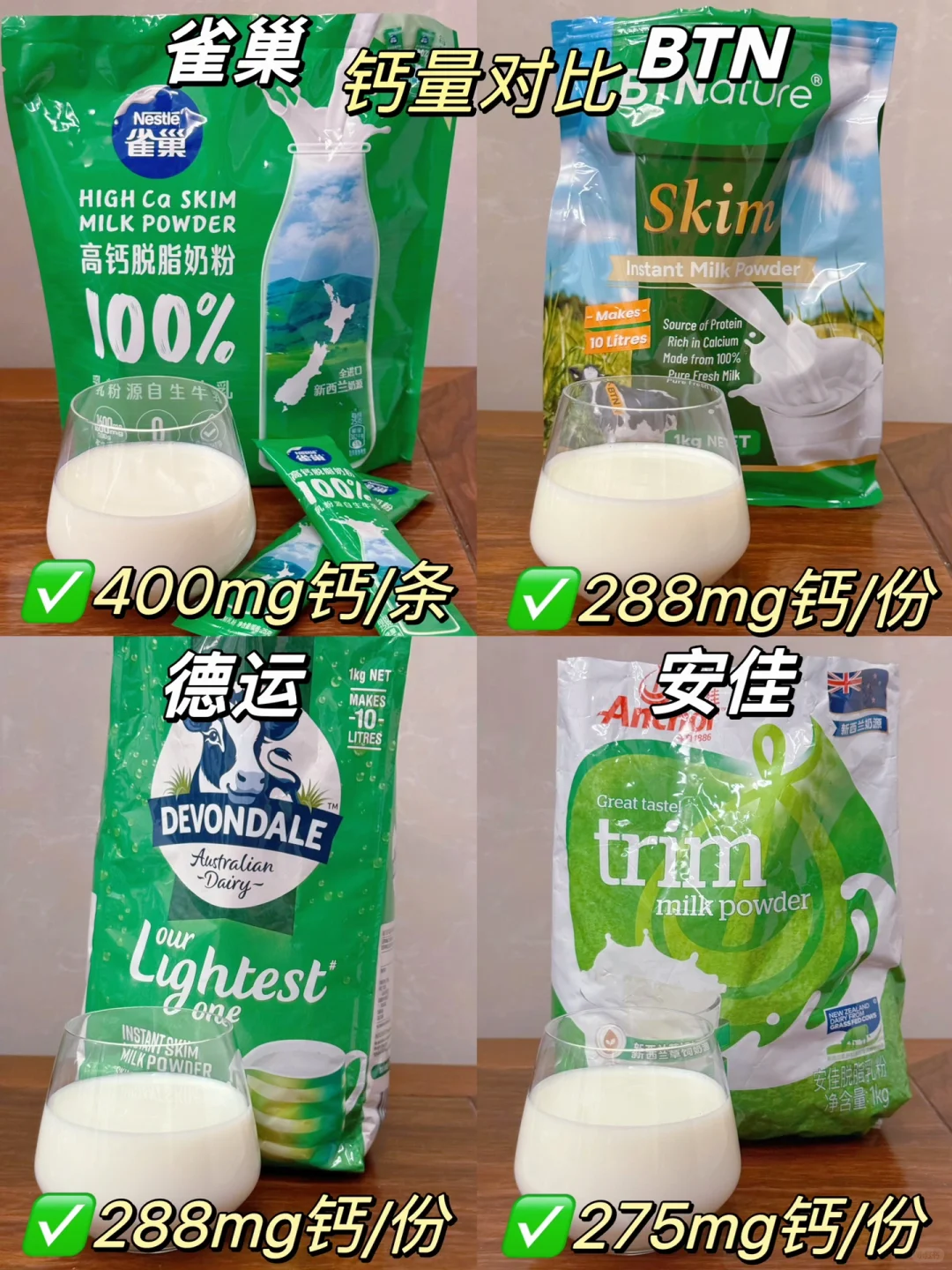 ✅对比的4款都是大品牌,进口奶源,配方好纯净。基本每一杯都有200多mg的钙,雀巢“小绿条”更是惊人的高达每一杯400mg的钙含量,真的是脱脂不脱营养!