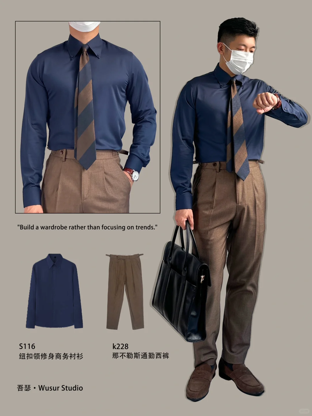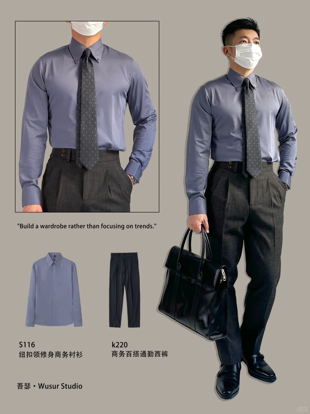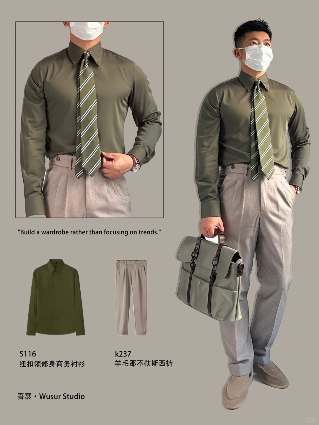 灰绿色衬衫➕浅杏色那不勒斯西裤,在商务场合或者休闲场合都可以轻松应对,给人轻松惬意舒适的感觉也体现男生的干净利落✅