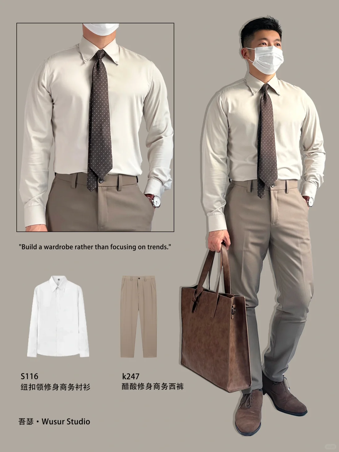 白玉色的自带谦谦君子风的衬衫,搭配卡其色醋酸西裤,体现男士商务轻熟的一面,也是老钱风流行的色系搭配,简约而不简单✅