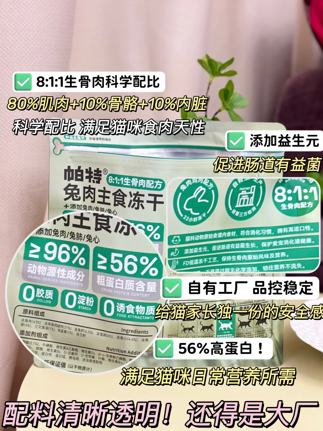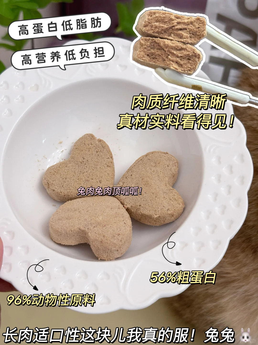 比如这次入手的帕特冻干,它用的是兔肉作为主要肉源,而兔肉是小猫咪原始食谱里就包含的,所以接受起来容易,我家毛孩子就hin喜欢吃兔兔🐰,每次都不会剩饭,加上兔肉营养价值还高,不但高蛋白、高赖氨酸、高消化率还低脂肪、低胆固醇、低热量,作为家养小猫咪的主食真的不错。