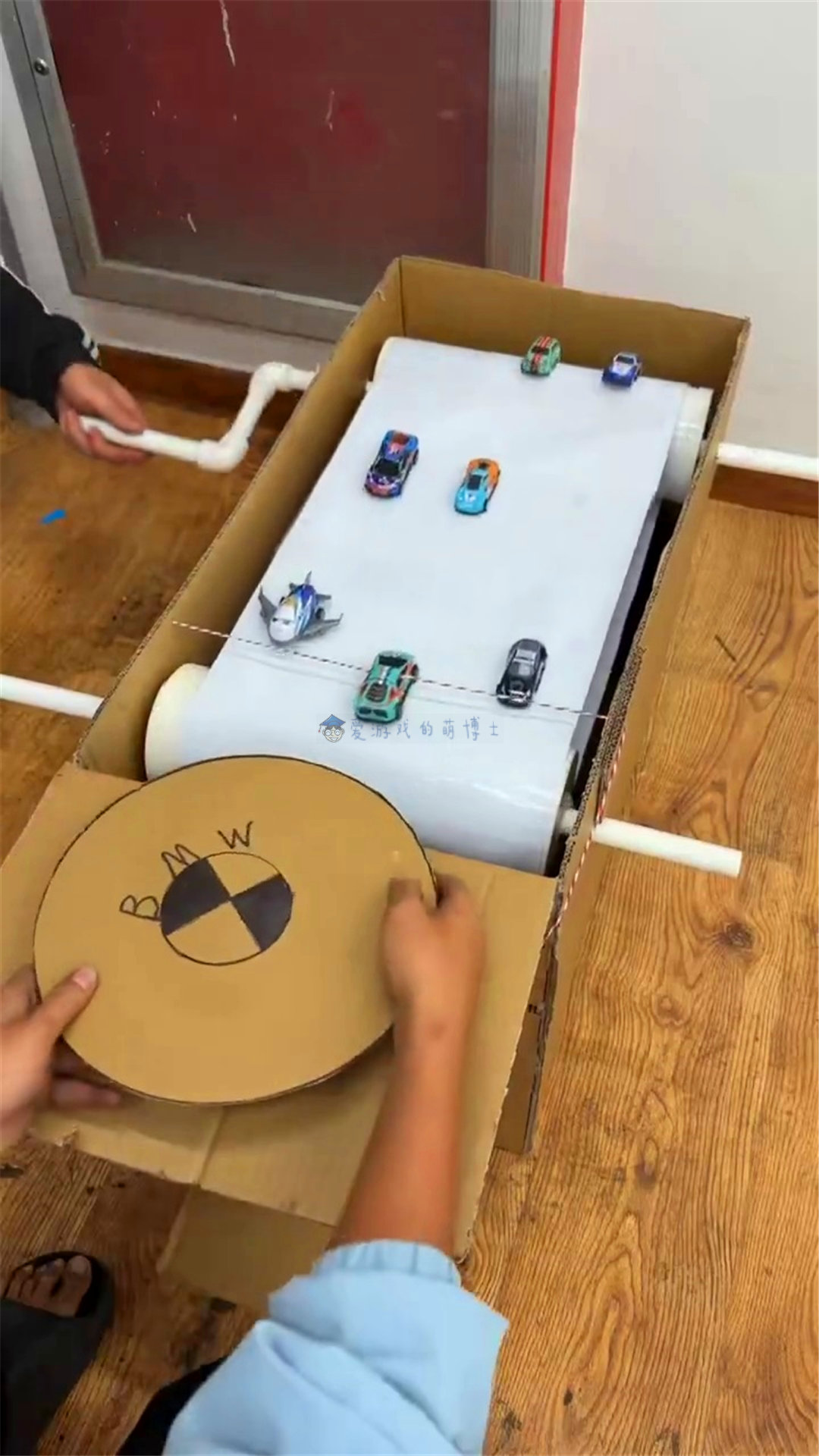作品是网红账号“ViralRush”分享,“世界最多映像ニュース”转发后火起来的,我们看到有高手用纸壳、纸张、小赛车模型、皮筋、转动手柄等等低成本的道具及材料完美还原了一款纵卷轴俯视视角的赛车游戏的游戏过程。一位玩家转动纸张,让固定在上面的小车往下移动,营造出另一位玩家控制的小车超越竞速的感觉。博士觉得最有意思、创意的地方在于:方向盘联动的皮筋不仅可以控制小车的左右移动,在不慎撞车的时候,还有翻车的效果!翻车完居然还可以复位,这和《公路战士》等游戏中的表现是一模一样的,十分有趣!网友们纷纷感叹:“哇!这确实是至今为止个人见过的最酷的DIY赛车游戏啊!其他的迷你车一个接一个,需要不停躲避,非常刺激!碰撞的瞬间挺搞笑的”。