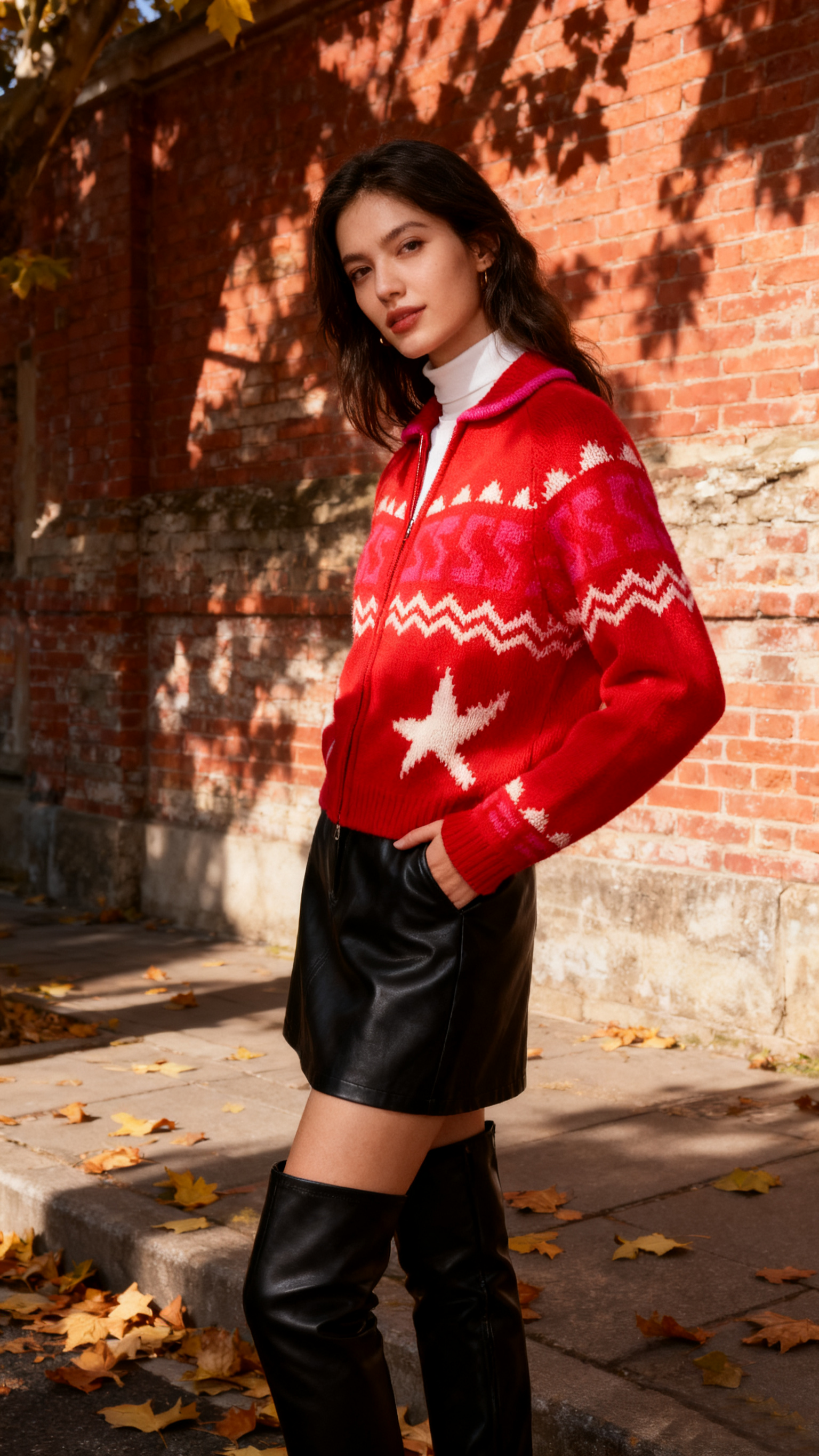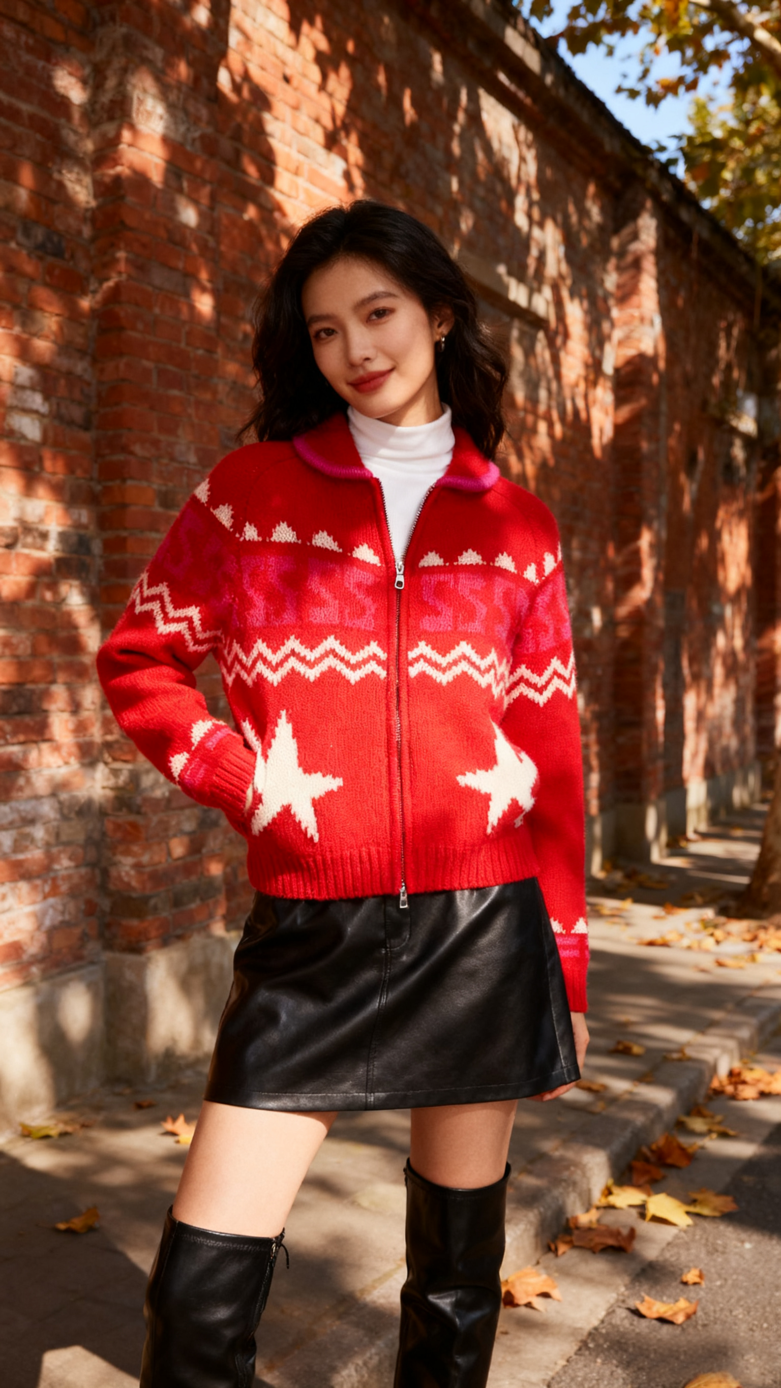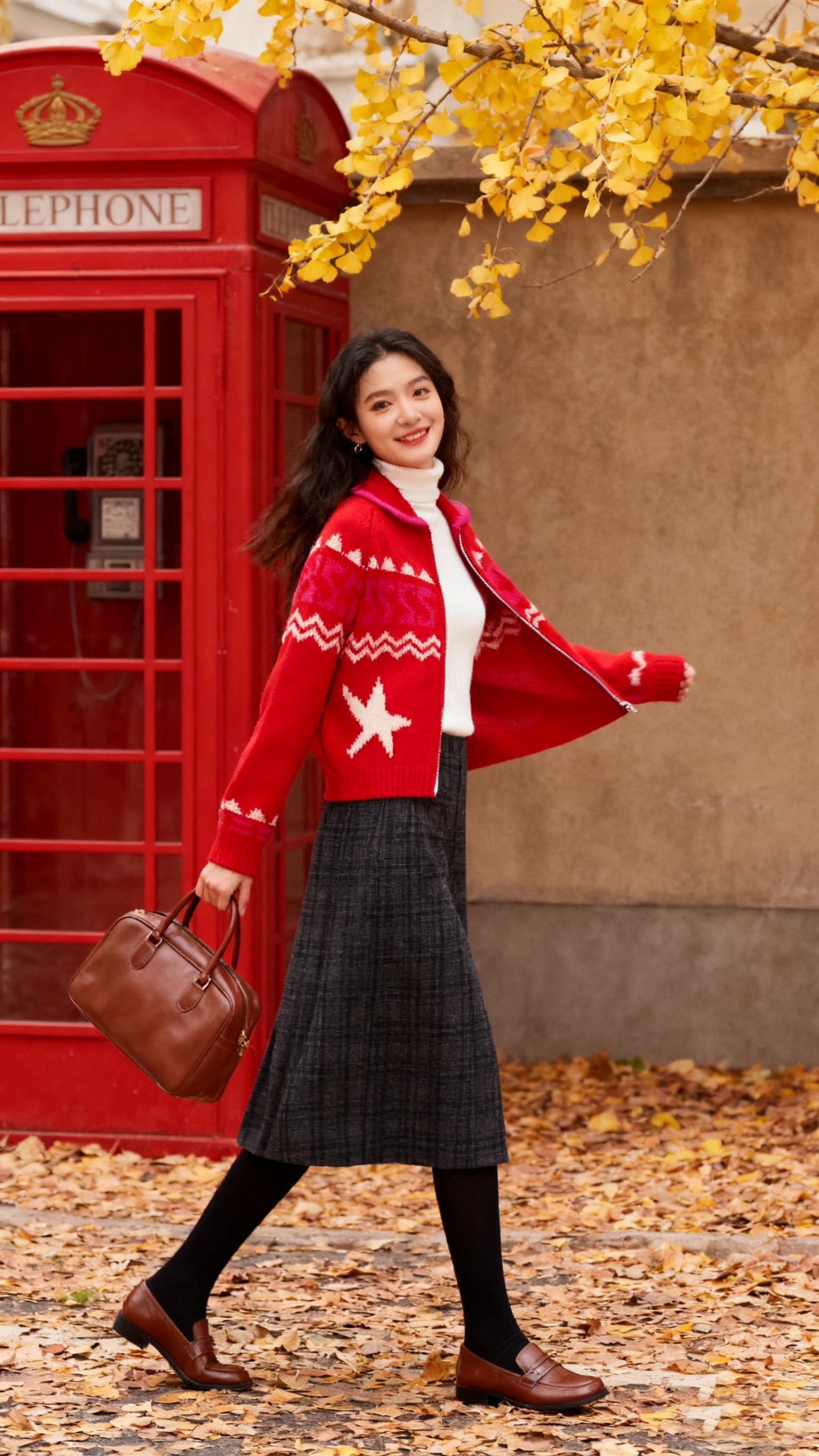 面料是软乎乎的羊毛混纺,贴肤穿不扎身,办公室开空调穿刚好,不会像厚毛衣那样闷热,早晚通勤搭件外套也不臃肿。洗了几次后,五角星刺绣没勾丝,面料也没起球,依旧保持挺括,比普通开衫耐穿太多。现在这件开衫已经成了我秋冬通勤的 “保底选择”,不用纠结搭配,穿去办公室既不沉闷又显气色,连领导都夸 “你这身穿搭很得体”!对于想在通勤穿搭里加点细节,又不想太张扬的人来说,这件五角星开衫真的太合适了,穿一次就知道 “比纯色更有细节” 的快乐!