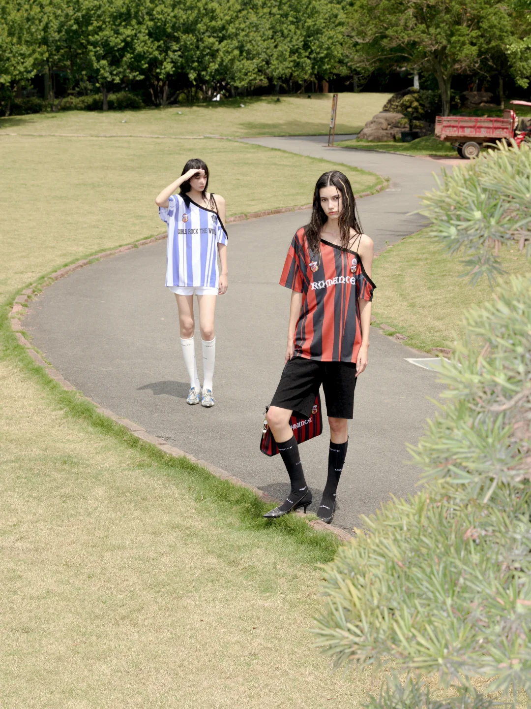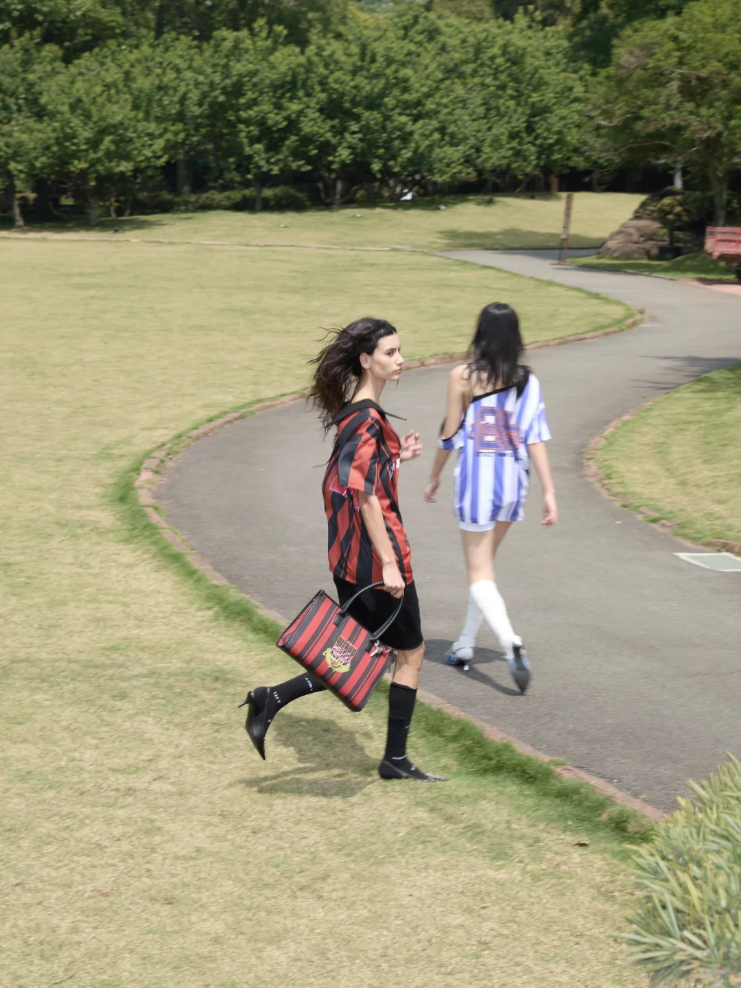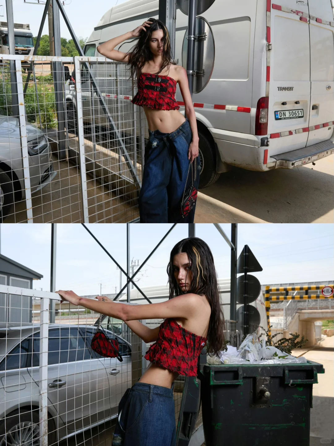 2024 SS 系列将朋克和摇滚元素融入设计,如抹胸、球衣、背心、中裤、低腰牛仔、渔网、金属、皮绊、铆钉等元素,从创作过程中的自省探索,到土壤滋养下的潮流艺术,slogan向观众们呈现了个体自由和对立统一的舞台演绎,传递本季释放狂妄、接纳对立的态度。