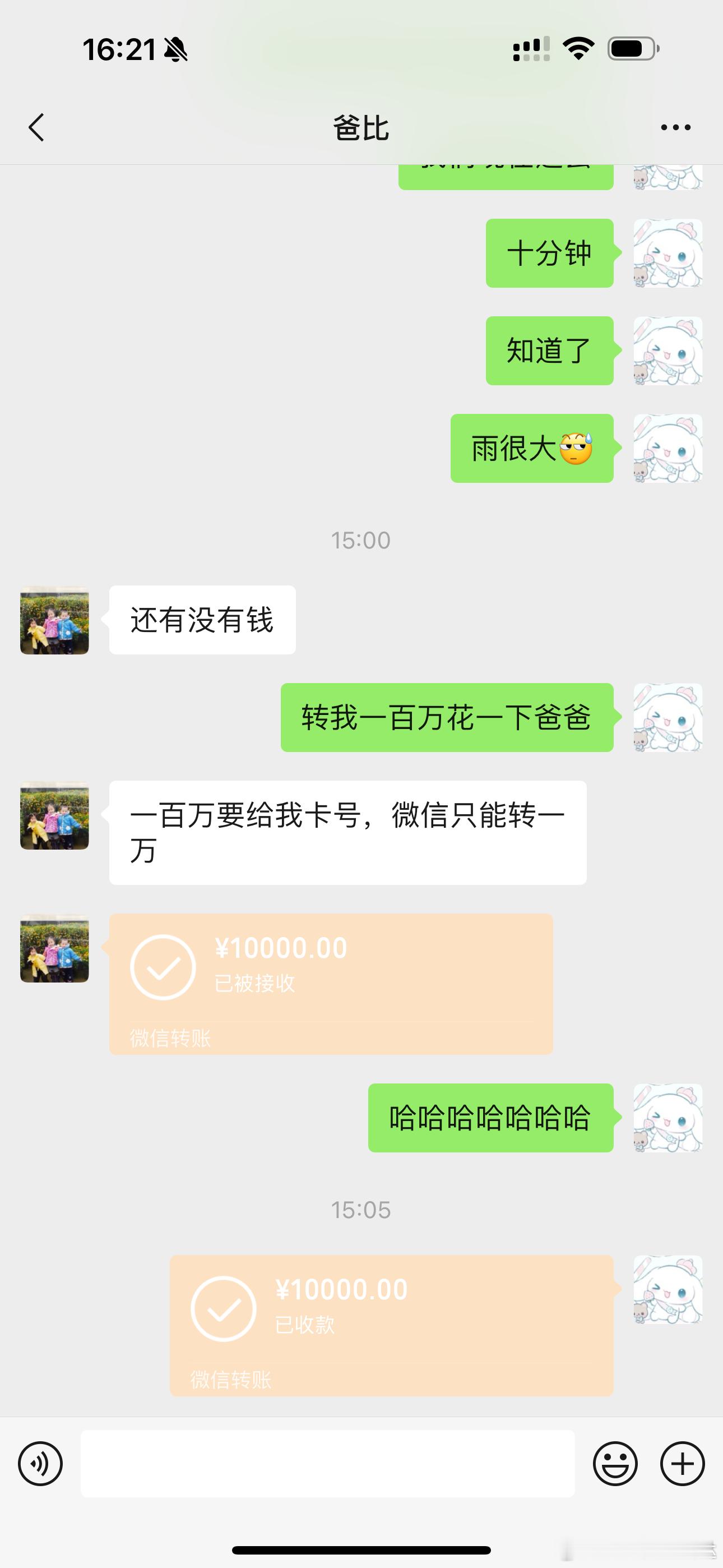其实自己从来不缺钱花但是我爸真的是世界上最好的爸爸 平时只要不在家都一直惦记着我生怕我不够钱用 三天两头找我问我去哪了 嘻嘻真的好爱我爸[爱你]