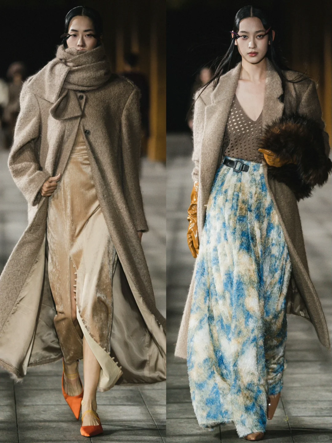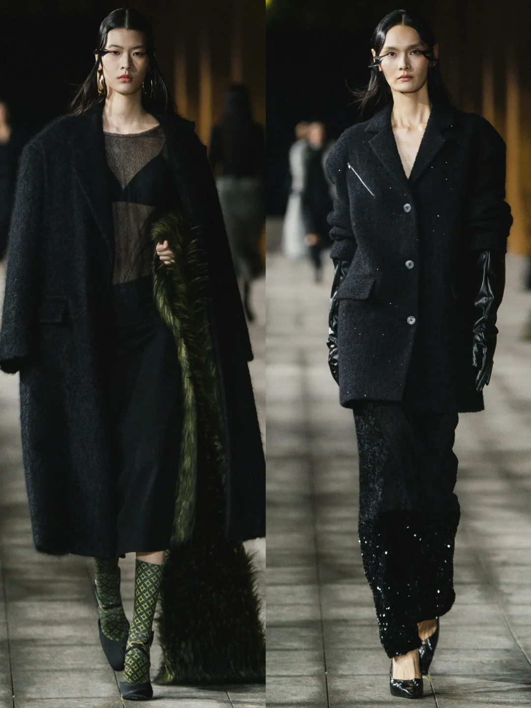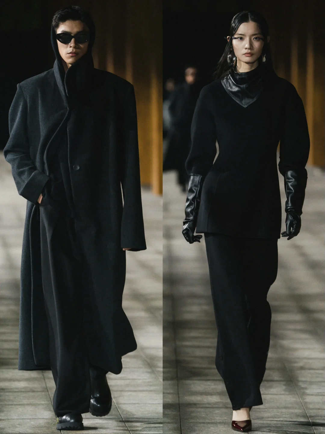 这一季的作品中,传统工艺是YIYI易一的怀旧和致敬,也是时尚的复古元素,与现代审美相糅合,以诠释轮廓之美的设计展现简约出众,为这一季冬日美学格调焕发新貌。通过皮革、皮草、镂空蕾丝、刺绣图案、重工的大面积点缀、卷曲的荷叶边等元素表现女性的柔美与魅力。以及为简约设计增添的视觉亮点,系列于廓形大衣与柔软织物,剪裁利落的直身连衣裙上的崭新呈现,或披挂、或围绕,在轮廓张弛间,勾勒 Gentlewomen 余裕自在的形态。对自由精神的追求,从松弛的空间气场中升起,又在舒适的感受间归隐于无形。
