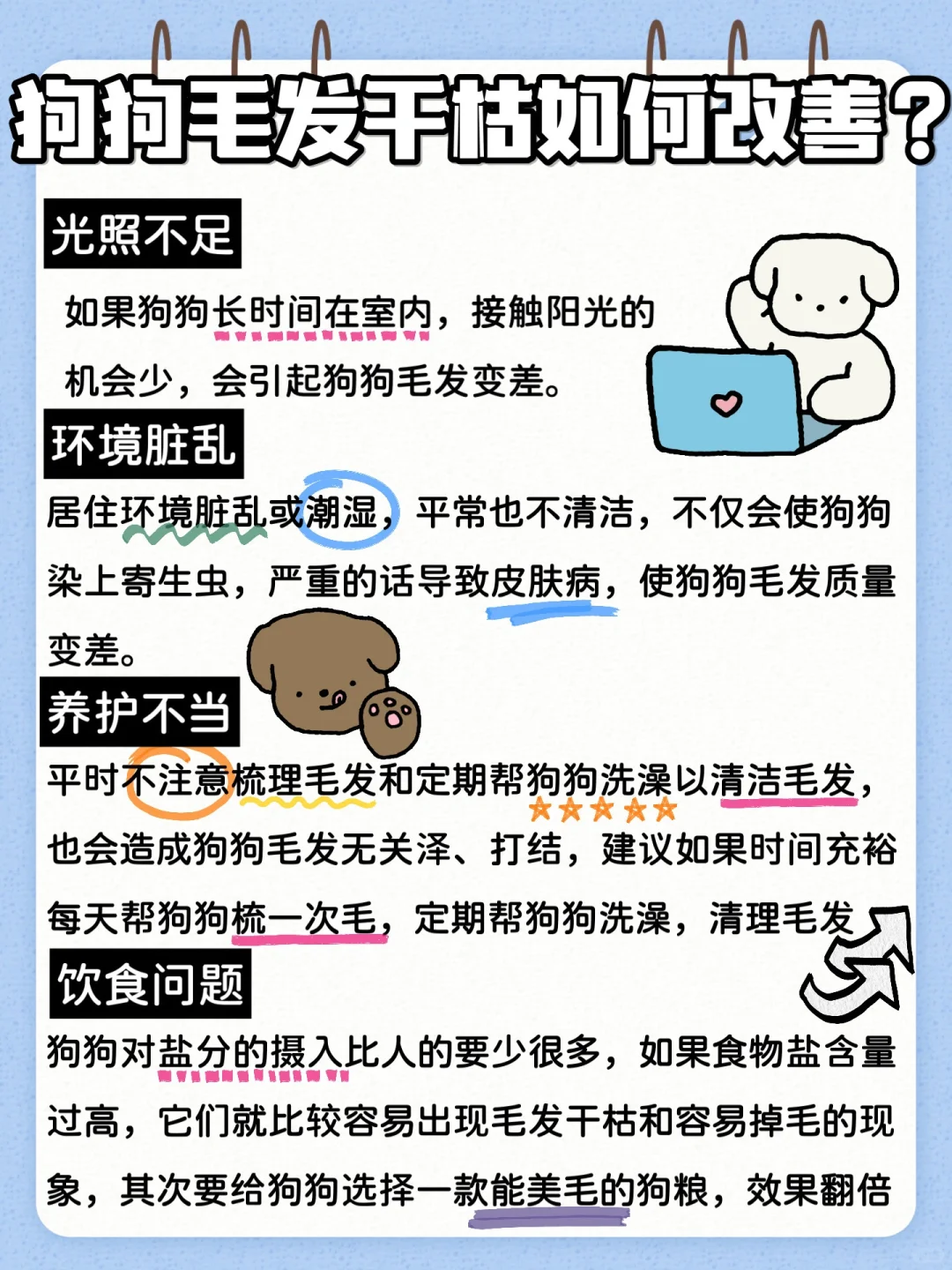 平时不注意梳理毛发和定期帮狗狗洗澡以清洁毛发,也会造成狗狗毛发无关泽、打结,也容易增加皮肤病/寄生虫的风险,建议如果时间充裕,每天帮狗狗梳一次毛,定期帮狗狗洗澡,清理毛发。