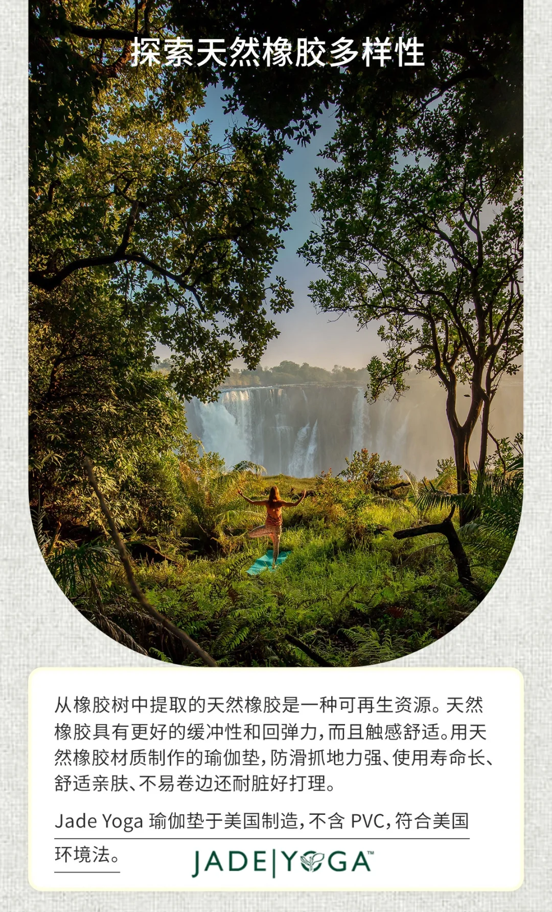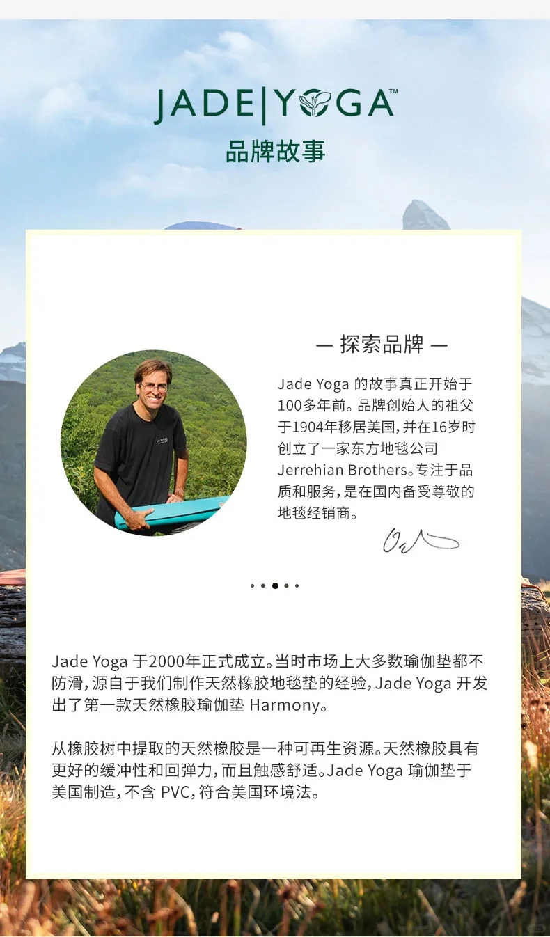 品牌理念: JADE YOGA来自美国,于2000年正式成立,作为天然橡胶瑜伽垫的鼻祖,也是欧美高端纯天然瑜伽垫的顶流产品,更是有着 “防滑界天花”的美称。 当时市场上大多数瑜伽垫都不防滑,于是Jade Yoga 开发出了世界上第一款天然橡胶瑜伽垫 Jade Harmony,一门心思解决一个问题 ,那就是“防滑 ”经过24年的耕耘,现在已经成为备受美国瑜伽习练者热爱的瑜伽垫品牌。