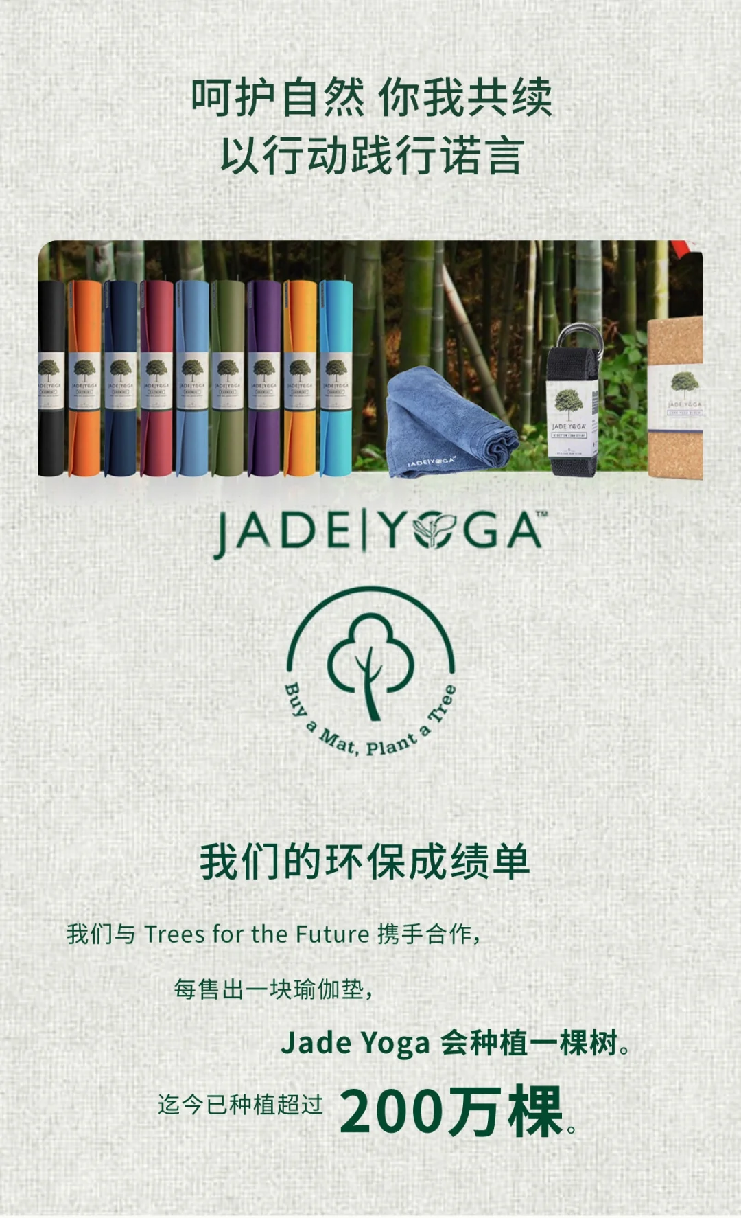 追求环保 eco - friendly:Jade向社会和环境诚诺的“Buy a mat, plant a tree“计划,致力于通过“售出一件瑜伽垫就为地球种下一棵树”来回馈地球,目前已经种下超过200万颗树。