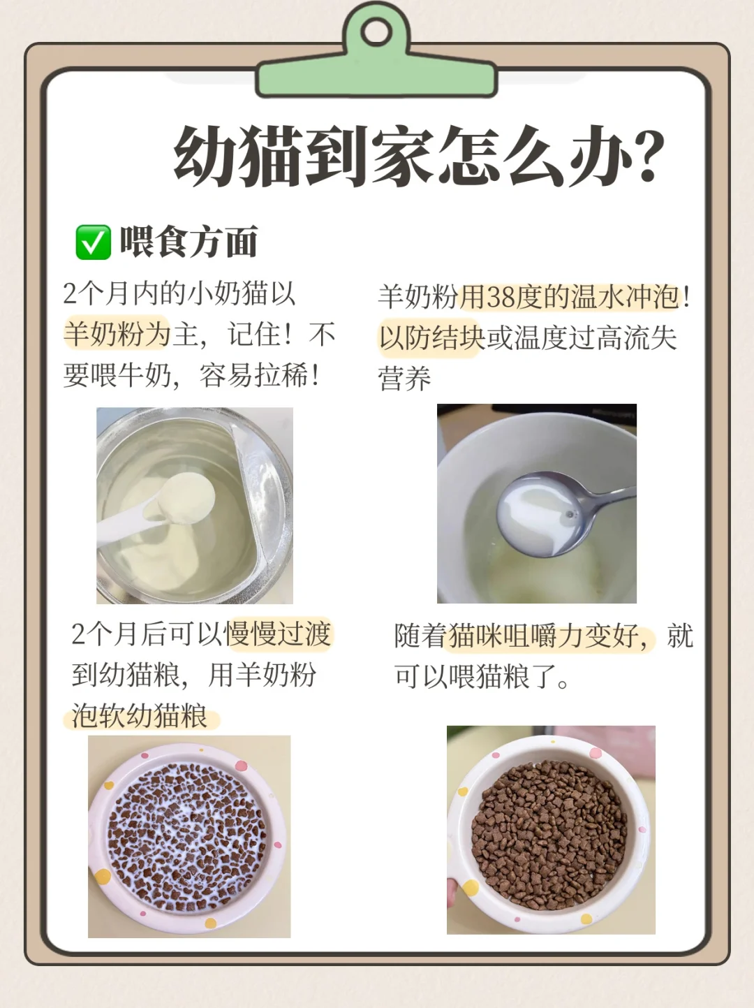 2个月内的小奶猫以羊奶粉为主,记住!不要喂牛奶,容易拉稀!羊奶粉用38度的温水冲泡!2个月后可以慢慢过渡到幼猫粮,用羊奶粉泡软幼猫粮,随着猫咪咀嚼力变好,就可以喂猫粮了。