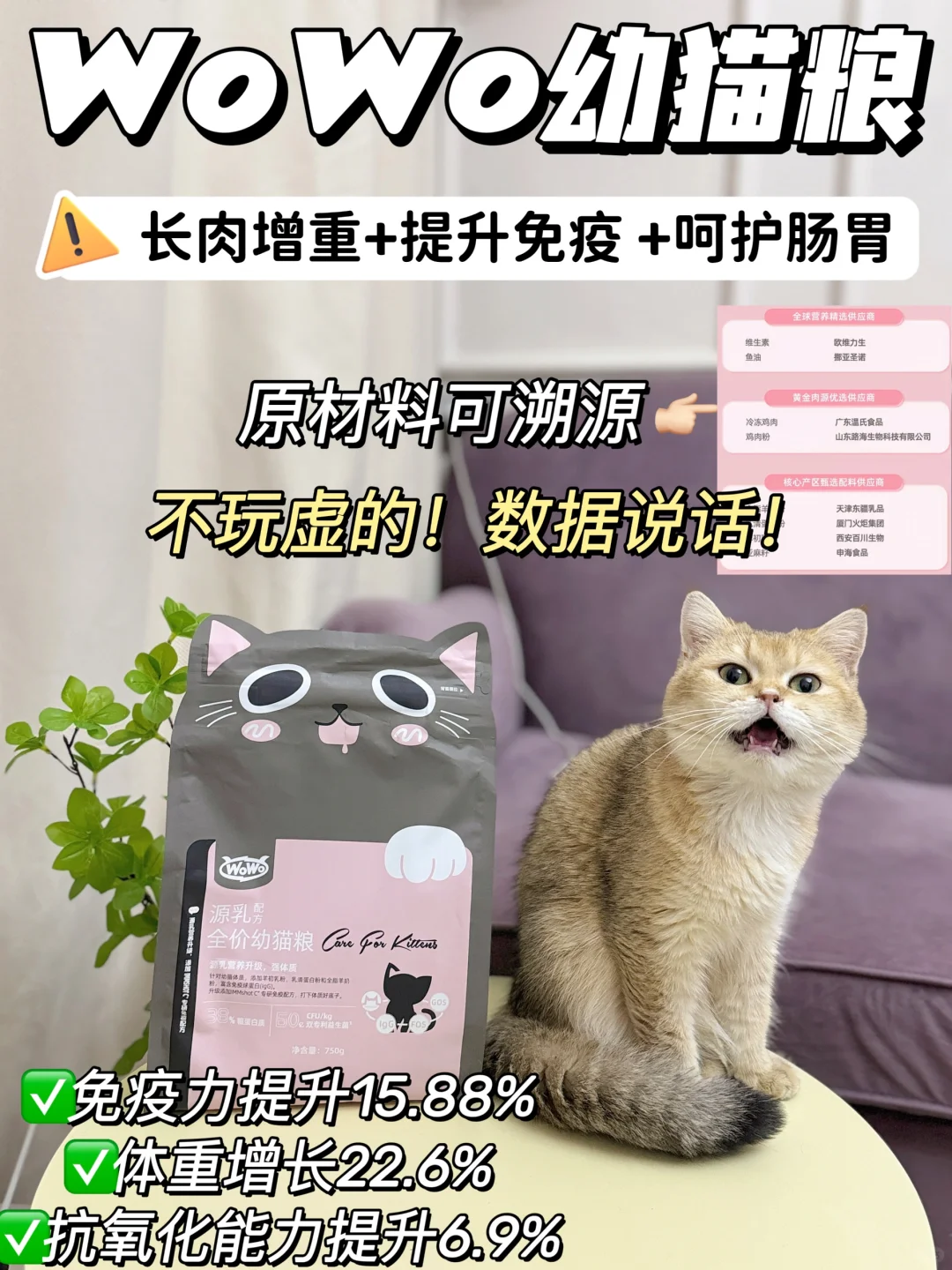 🐱我家毛孩子刚到家时就是吃WoWo幼猫粮,这款是经过山东农科院喂养试验的,实验结果30天免疫力提升15.88%,体重增加22.06%!