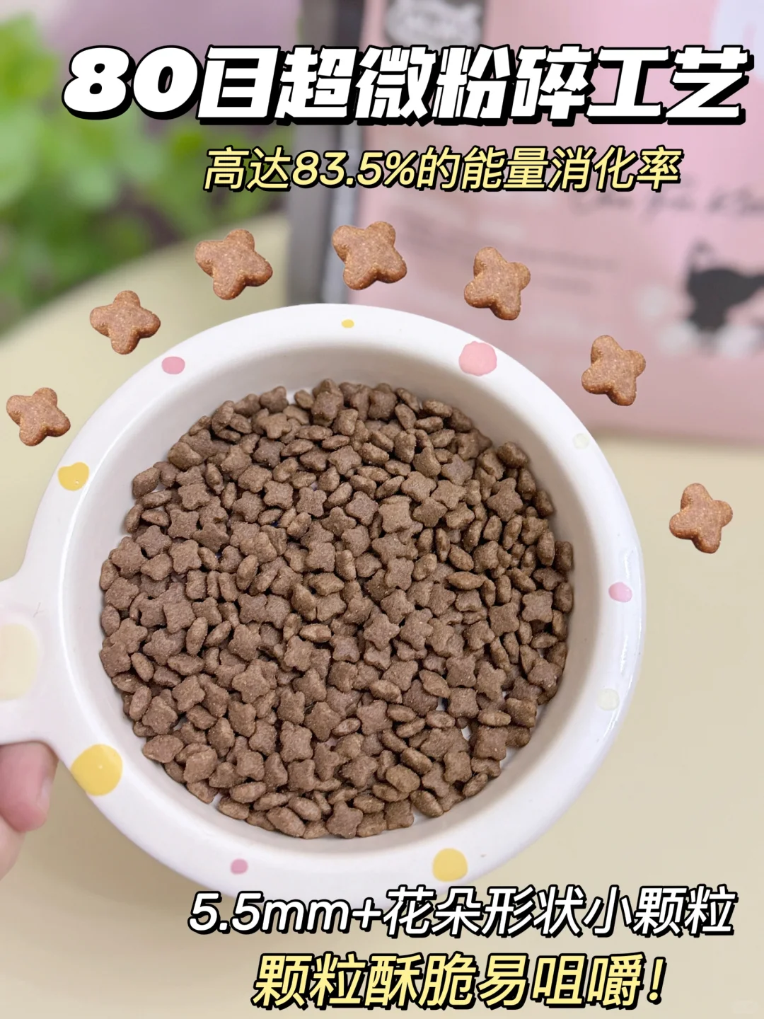 对于肠胃脆弱的毛孩子它也友好,不仅添加的60亿双专利益生菌益生元(中国发明专利,专利号:ZL201711164956.5,中国发明专利,专利号:ZL200910258587.5),帮助调节肠道菌群,还采用了80目超微粉碎技术,食材研磨的碎,毛孩子才能更充分的消化~花花小颗粒适合幼猫舔舐,特别是离乳期第一次吃粮的奶猫~