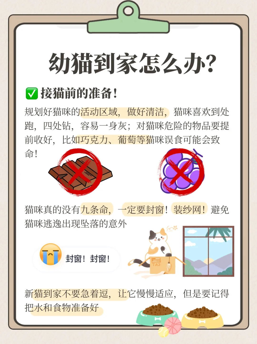 规划好猫咪的活动区域,做好清洁,猫咪喜欢到处跑,四处钻,容易一身灰;对猫咪危险的物品要提前收好,比如巧克力、葡萄等猫咪误食可能会致命!