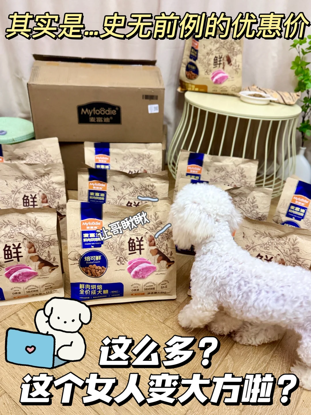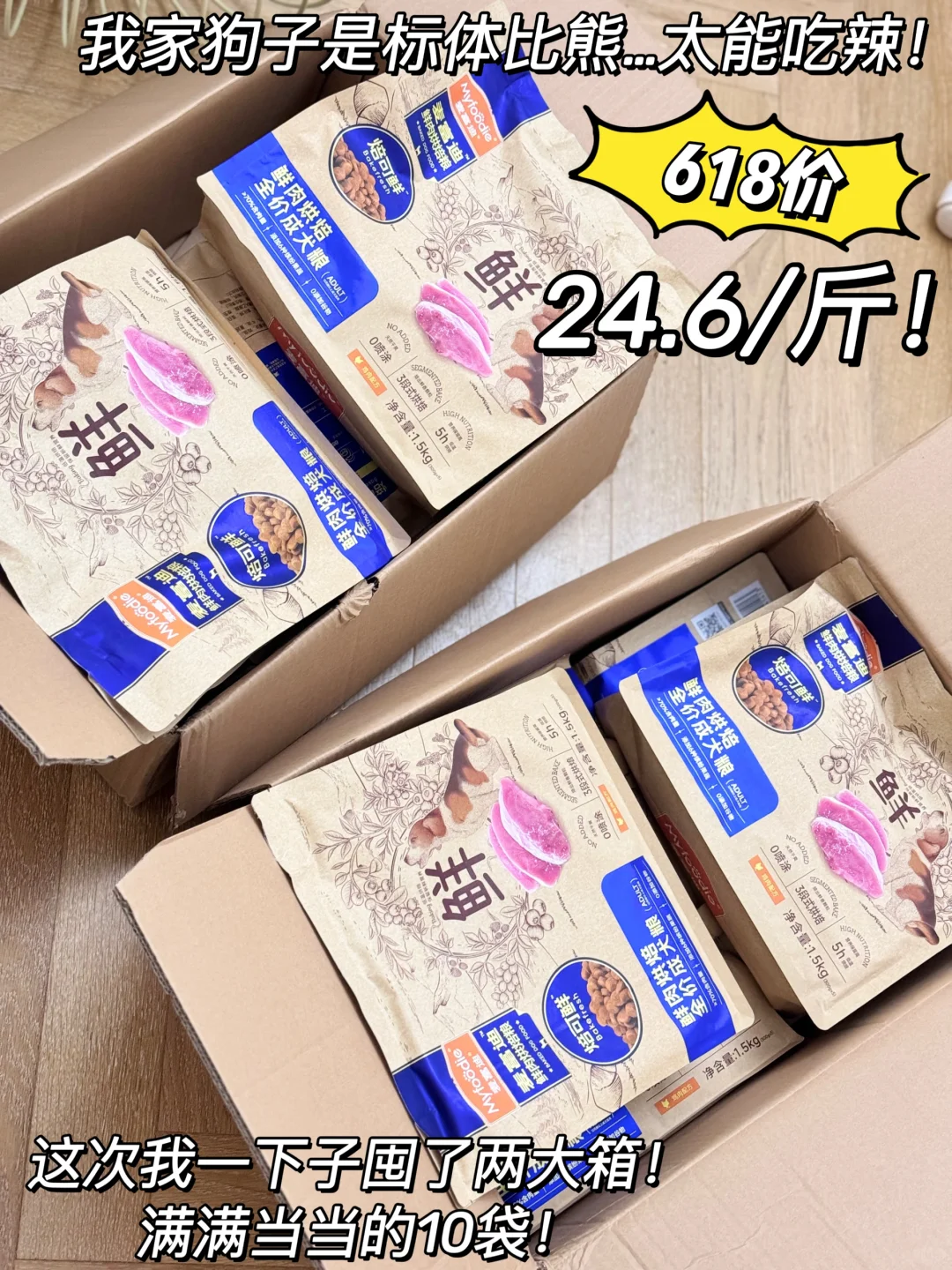 [抓狂R]我家毛孩子有段时间就是因为狗粮没有选好,怎么喂都是偏瘦,还容易生病,直到换了麦富迪烘焙狗粮,它是真长肉啊🥩,我家小狗子每次都超大口的干饭,没多久就恢复了往日的体型,而且粑粑状态和精神状态都不错,看我这次的囤货量就真的[赞R]我对它有多么满意,毕竟这么新鲜的狗粮不多见啊。