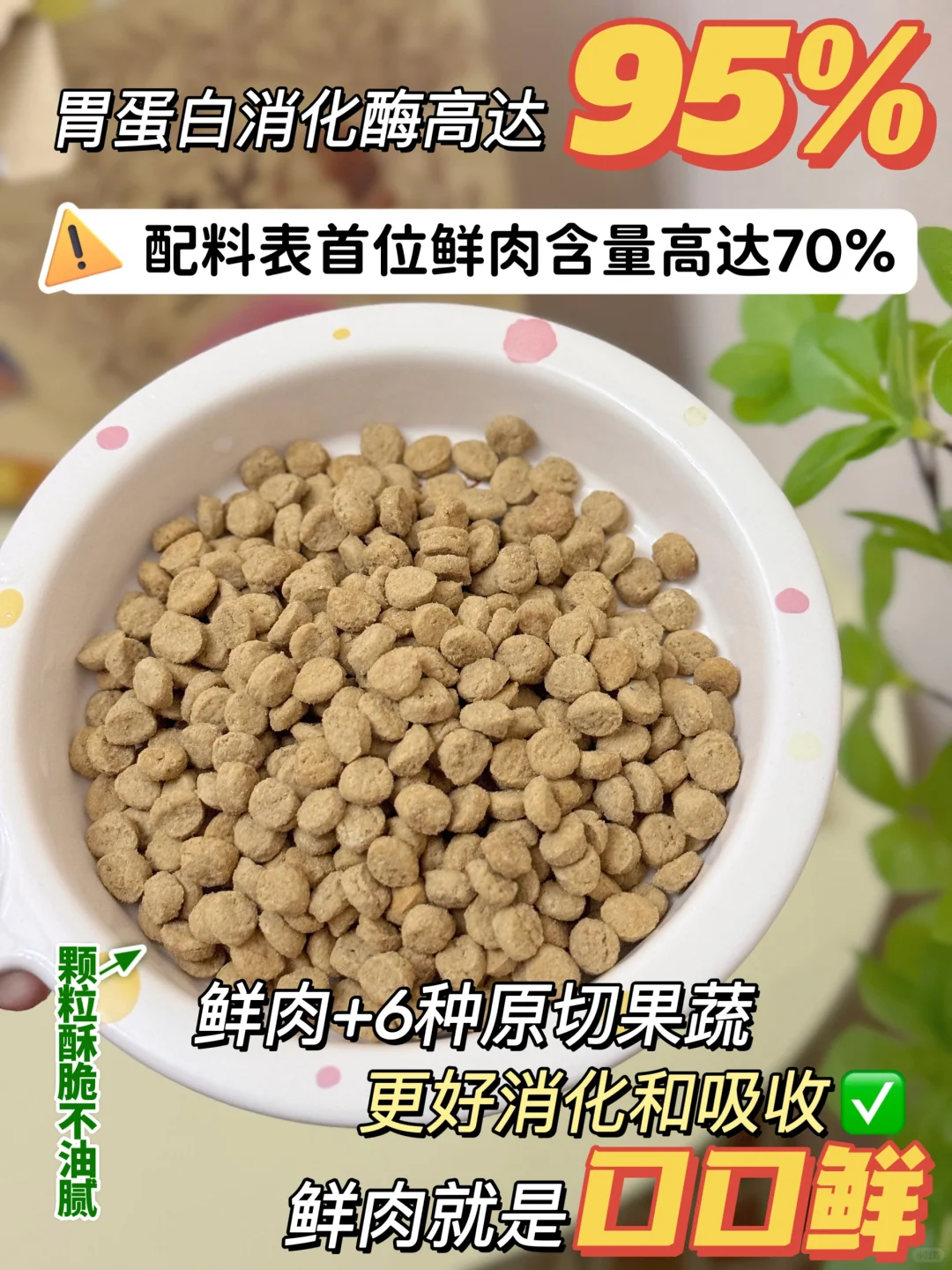 ▪️从原料开始就保证了新鲜,配料表第一位是70%真鲜肉,搭配6种原切果蔬营养可均衡。