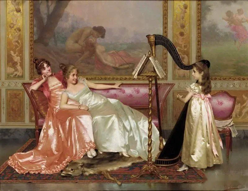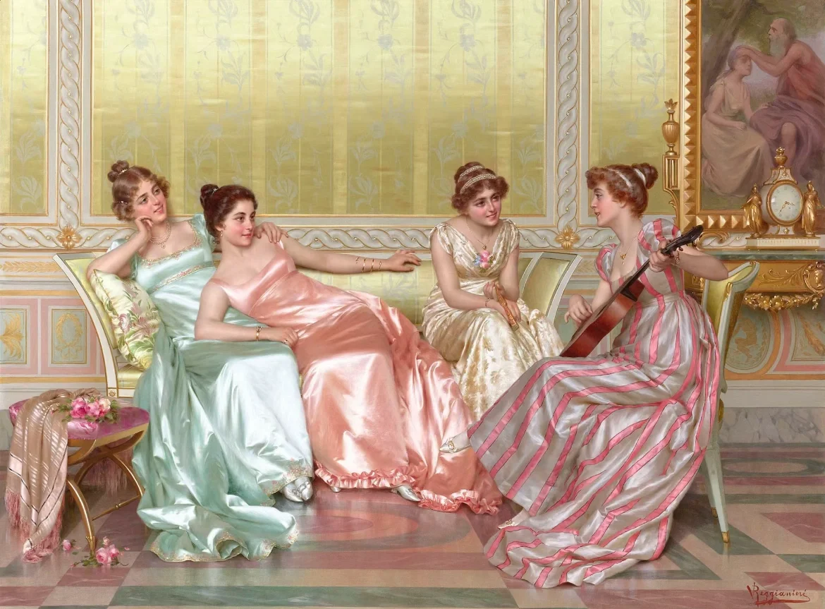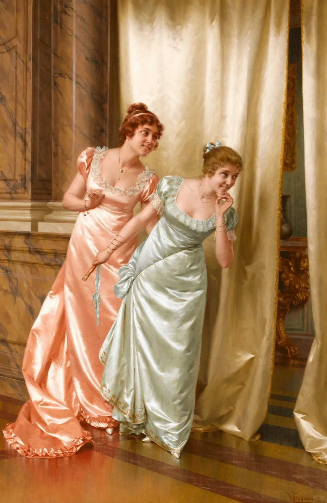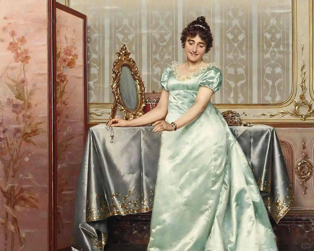 Vittorio Reggianini ( 1858-1939) 是一位意大利画家,他将幻想与现实、感性与感性相结合,最重要的是,就像许多佛罗伦萨历史流派画家一样,他画的服装都非常奢华, 成功地制作了流派作品,以几乎微型化的织物和家具渲染而受到大家的赞赏。
