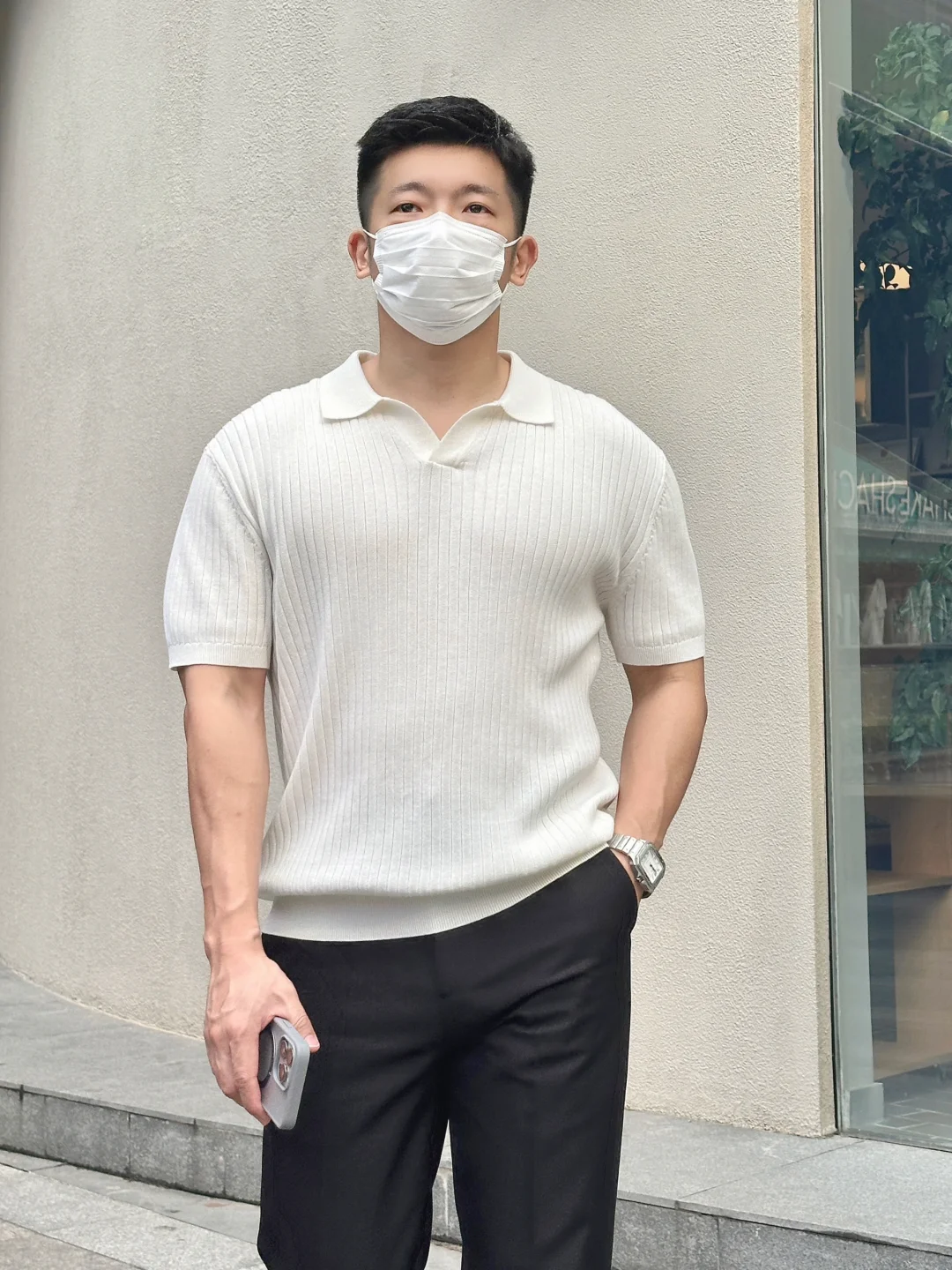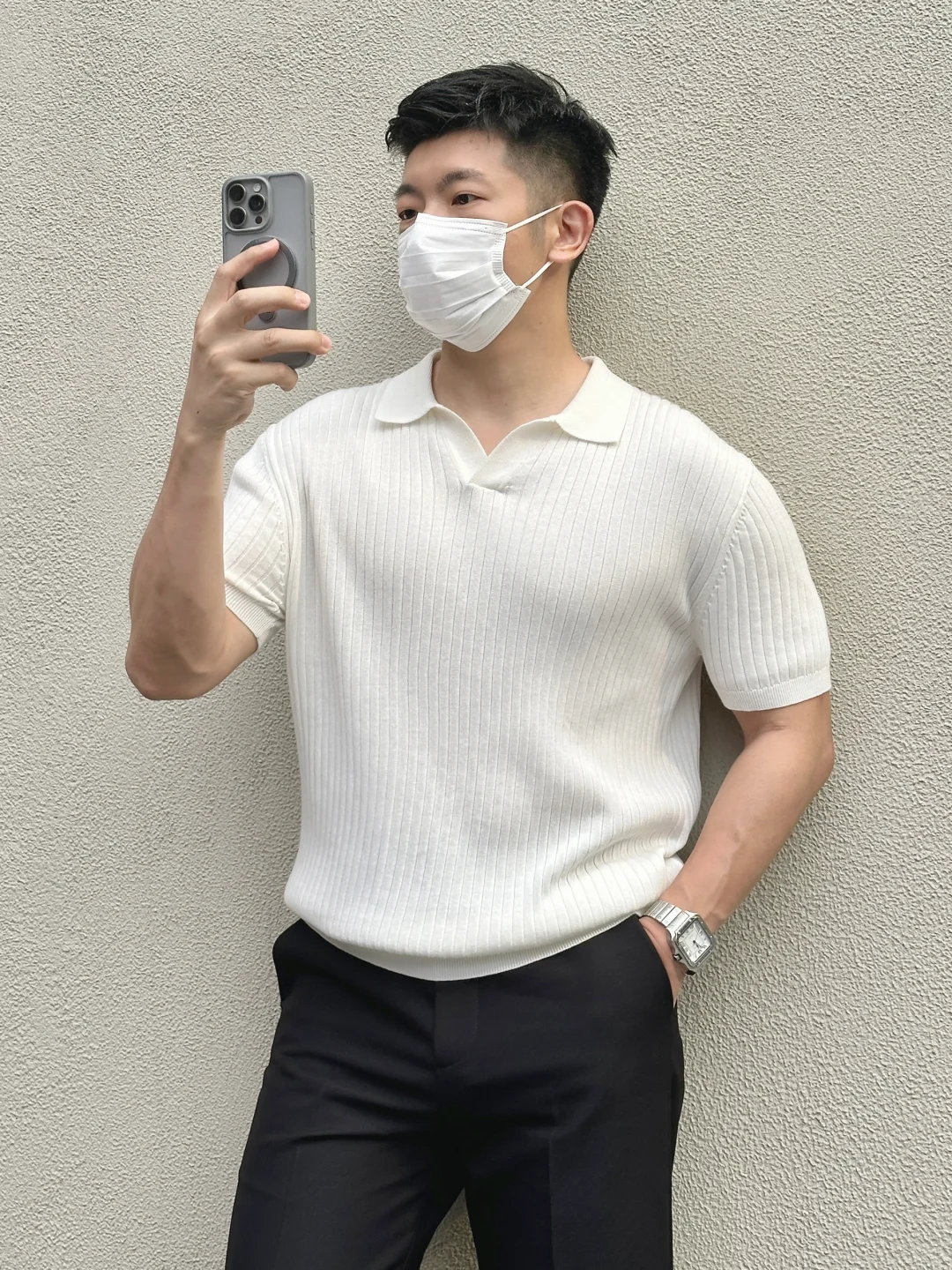 一件简单好看的白色坑条Polo衫真的就很加分➕