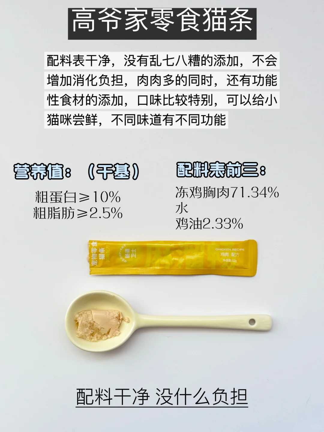 配料表干净,没有乱七八糟的添加,不会增加消化负担,肉肉多的同时,还有功能性食材的添加,口味比较特别,可以给小猫咪尝鲜,不同味道有不同功能