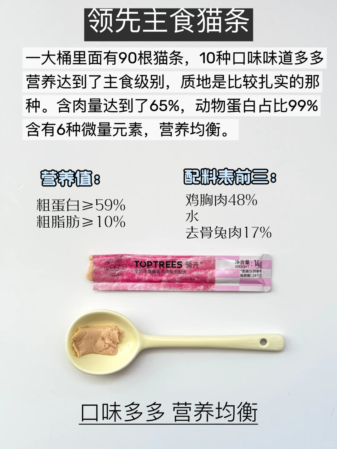 一大桶里面有90根猫条,10种口味味道多多,营养达到了主食级别,质地是比较扎实的那种。含肉量达到了65%,动物蛋白占比99%,含有6种微量元素,营养均衡
