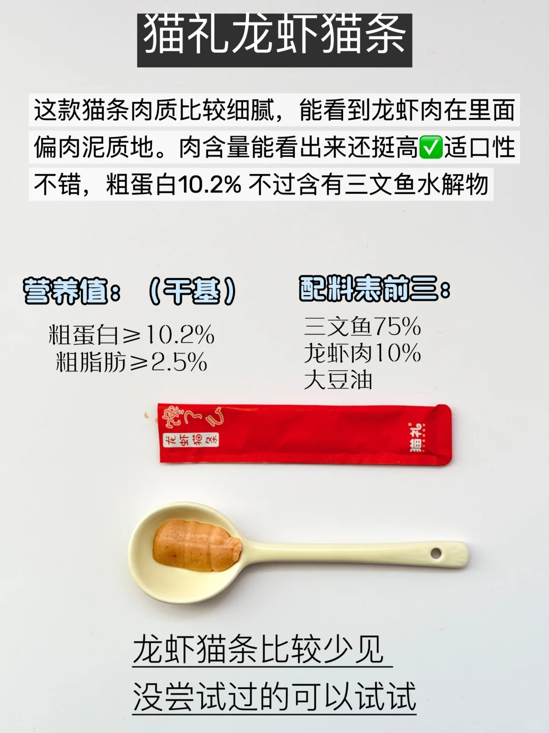 这款猫条肉质比较细腻,能看到龙虾肉在里面,偏肉泥质地。肉含量能看出来还挺高✅适口性不错,粗蛋白10.2%👍也是0胶、0诱食剂0色素等