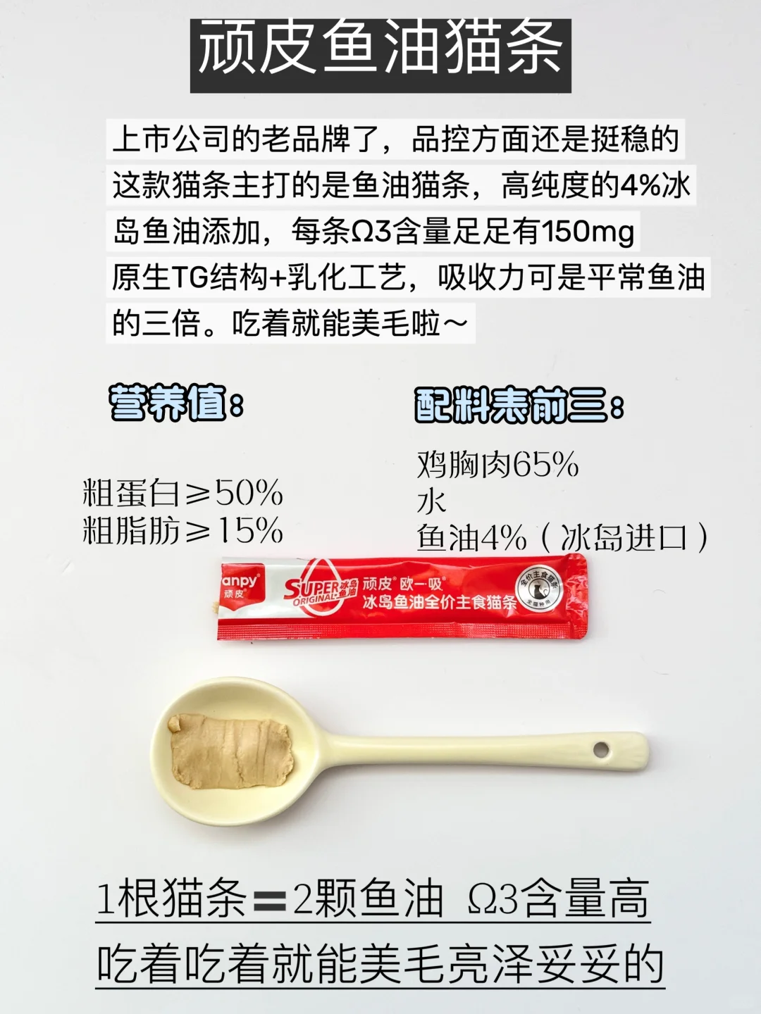 上市公司的老品牌了,品控方面还是挺稳的。这款猫条主打的是鱼油,添加高纯度的4%冰岛鱼油,每条Ω3含量足足有150mg,一根猫条=两颗鱼油。原生TG结构+乳化工艺,吸收力可是平常鱼油的三倍。吃着就能美毛啦~