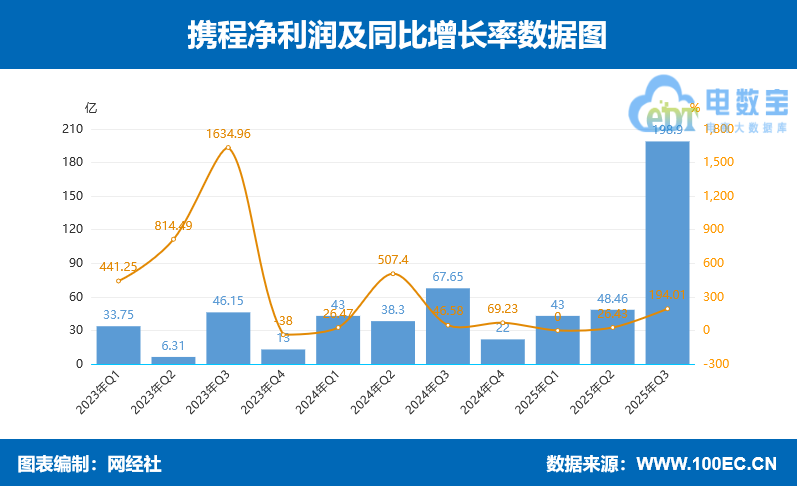 携程资产处置助推高增长 同程稳健提升2025年第三季度净利润为199亿元人民币(28亿美元),相比2024年同期净利润为68亿元人民币,相比上季度净利润为49亿元人民币。