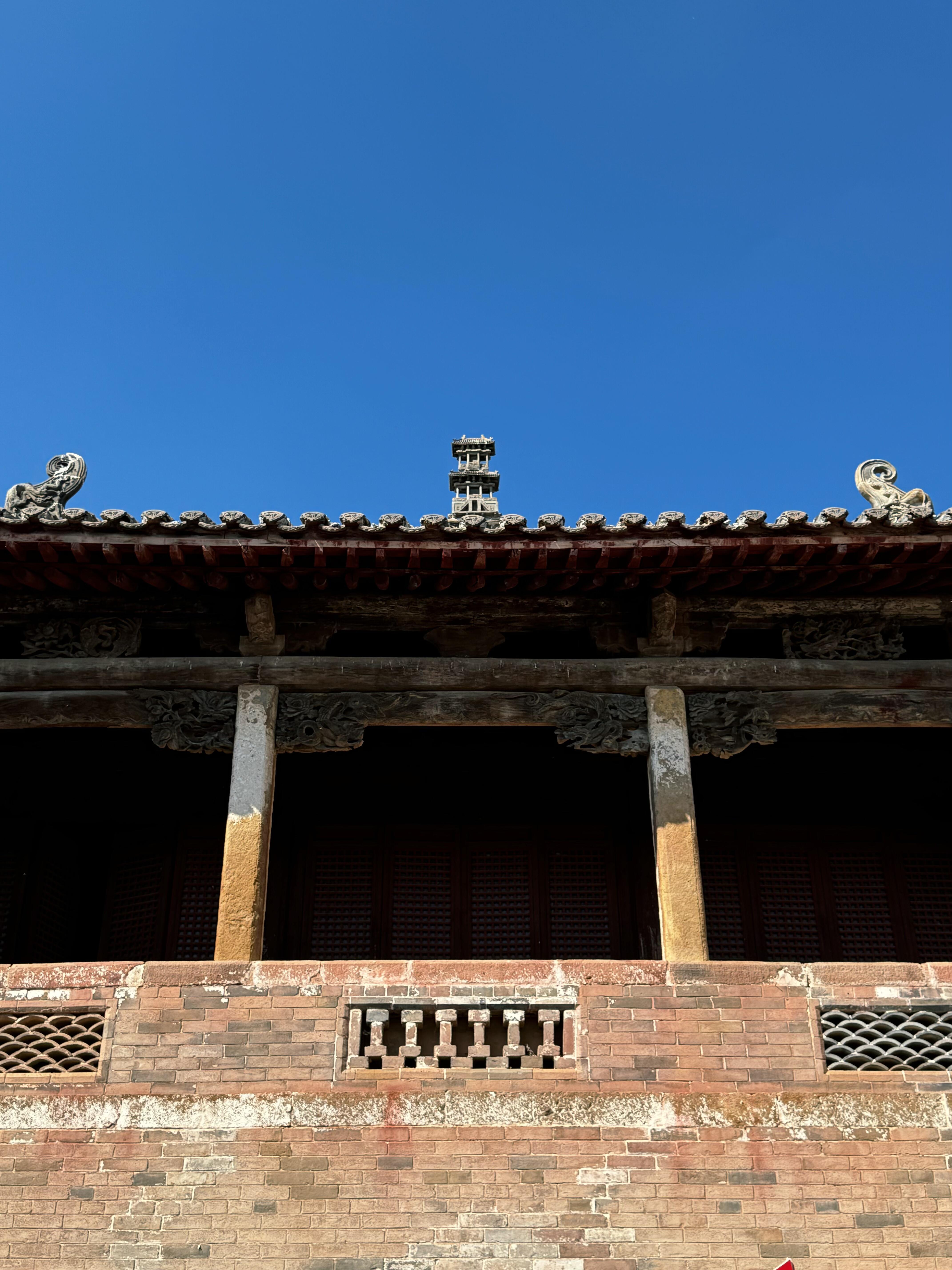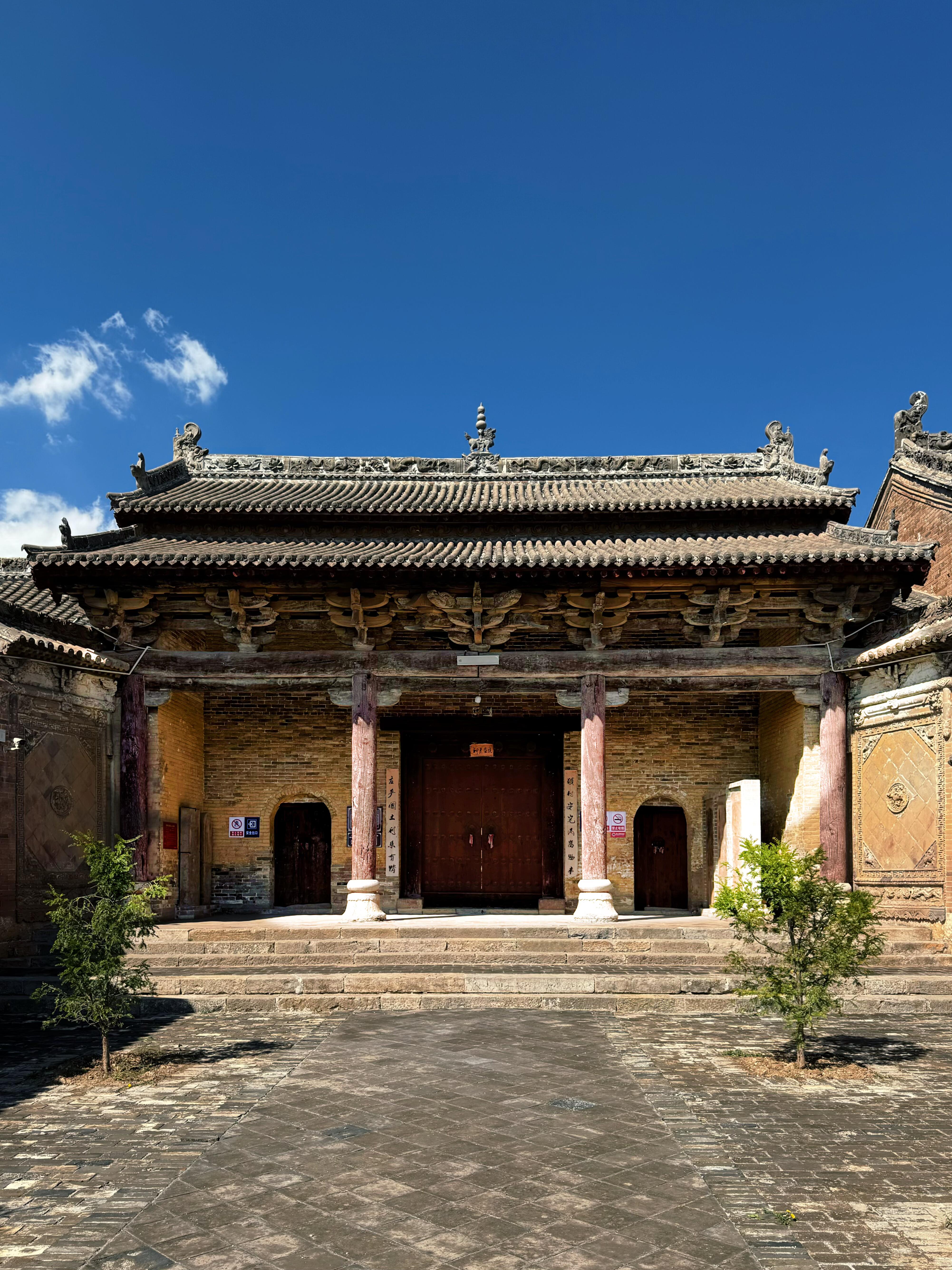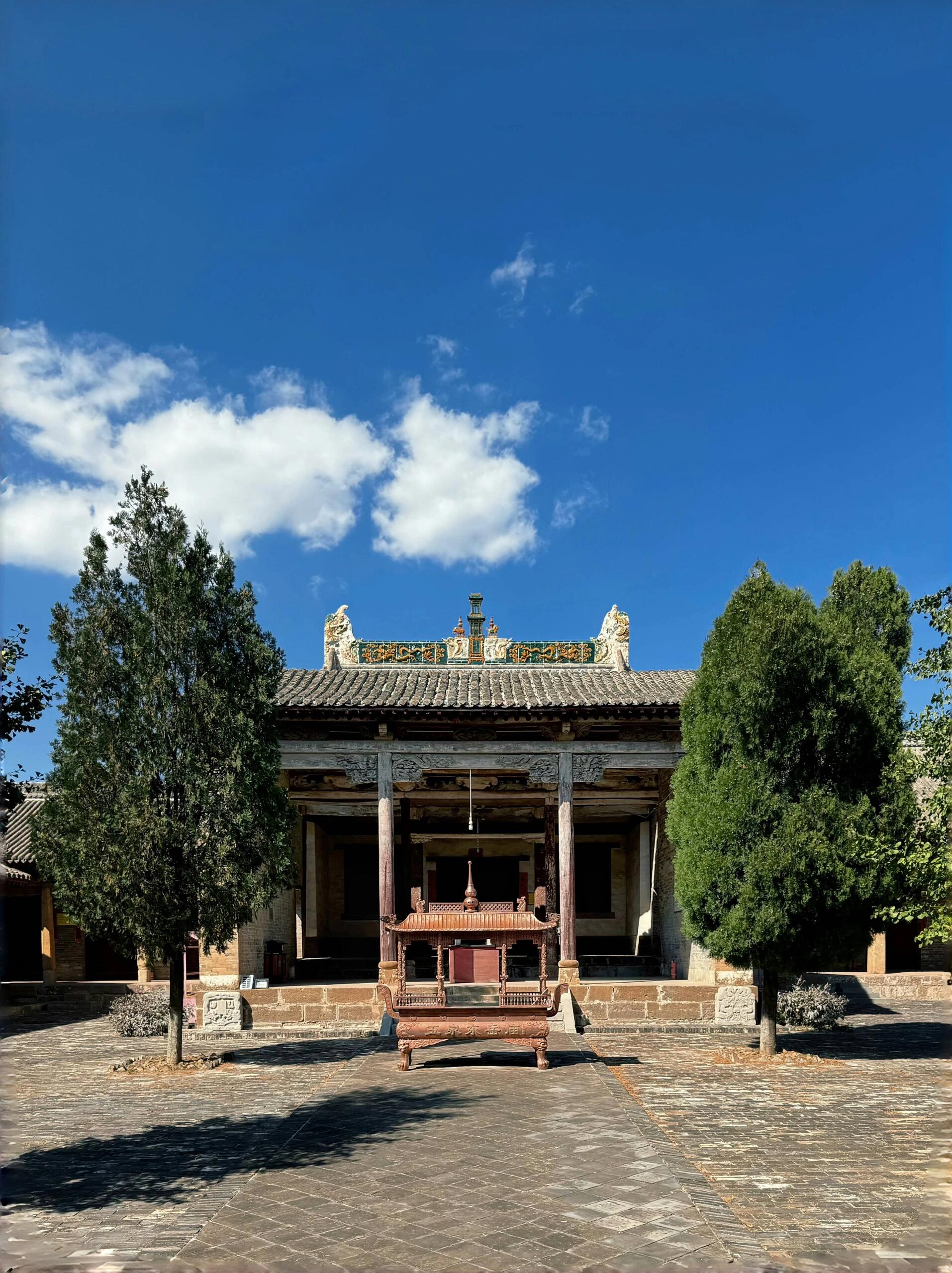 穿过山门,便能看到献殿。献殿建于清乾隆三十五年,它与正殿紧密相连,形成了一个有机的整体。献殿面宽三间,进深五椽,单檐卷蓬硬山顶的设计与山门的庄重形成了鲜明的对比,多了几分柔和与质朴。檐柱柱头设置的雀替、阑额和普拍枋,虽没有斗拱的华丽装饰,却也以简洁大方的风格展现出别样的韵味。看着这些构件,不禁让人好奇,在当时的建筑语境下,为何舍去了斗拱这一传统建筑中常见的装饰元素?有人推测,这可能是因为献殿的功能性需求,不需要过多的装饰来突出其地位,而简洁的设计更能满足祭祀等活动的实用需求;但也有人持不同意见,认为这或许是当时建筑风格转变的一个体现,清乾隆时期流行更加简约的建筑美学,所以在献殿的建造上也有所体现。