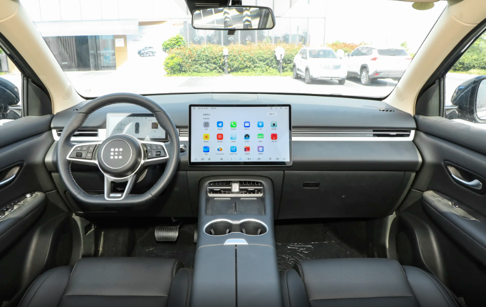 内饰设计布局整体依旧是横平竖直的设计风格,因为用料做工还不错,所以并不会给人一种廉价感,当然质感还是要差一些,毕竟造车成本摆在那里。相比于纯黑色内饰,个人更推荐选择棕色内饰,看起来更加温馨舒适,不像黑色内饰那般死气沉沉。大尺寸悬浮中控屏看起来略微有些呆板,不过这是当前比较常见的一项配置,也没什么好说的,屏幕UI界面设计简单大方,内置主流科技配置,支持华为HiCar 4.0,与华为手机的适配程度比较高,应对日常用车无压力。