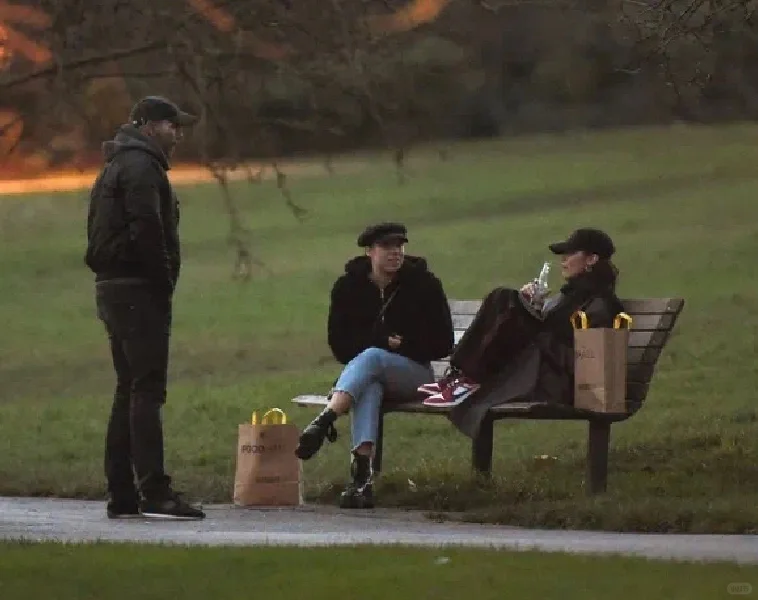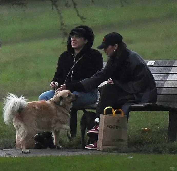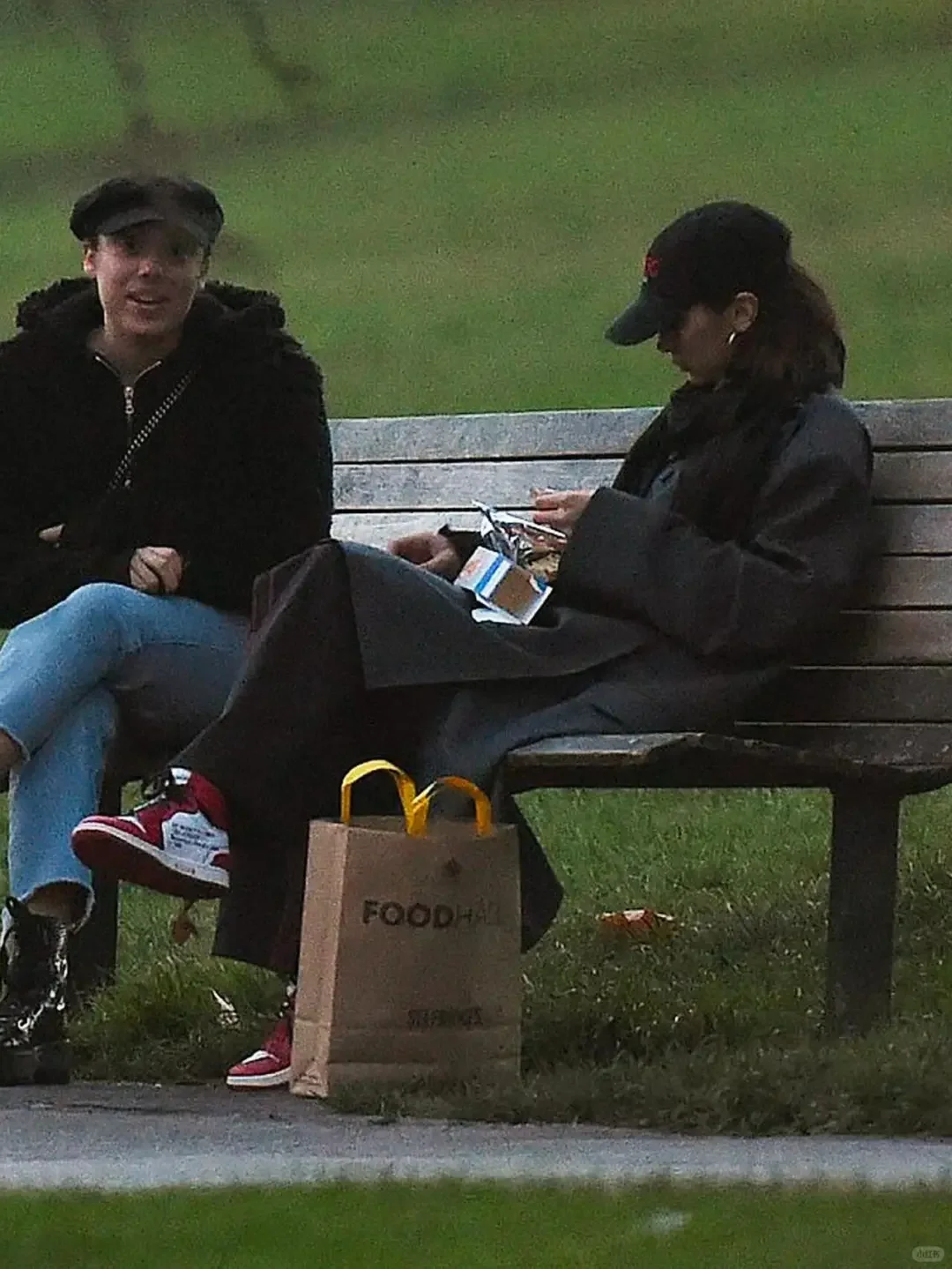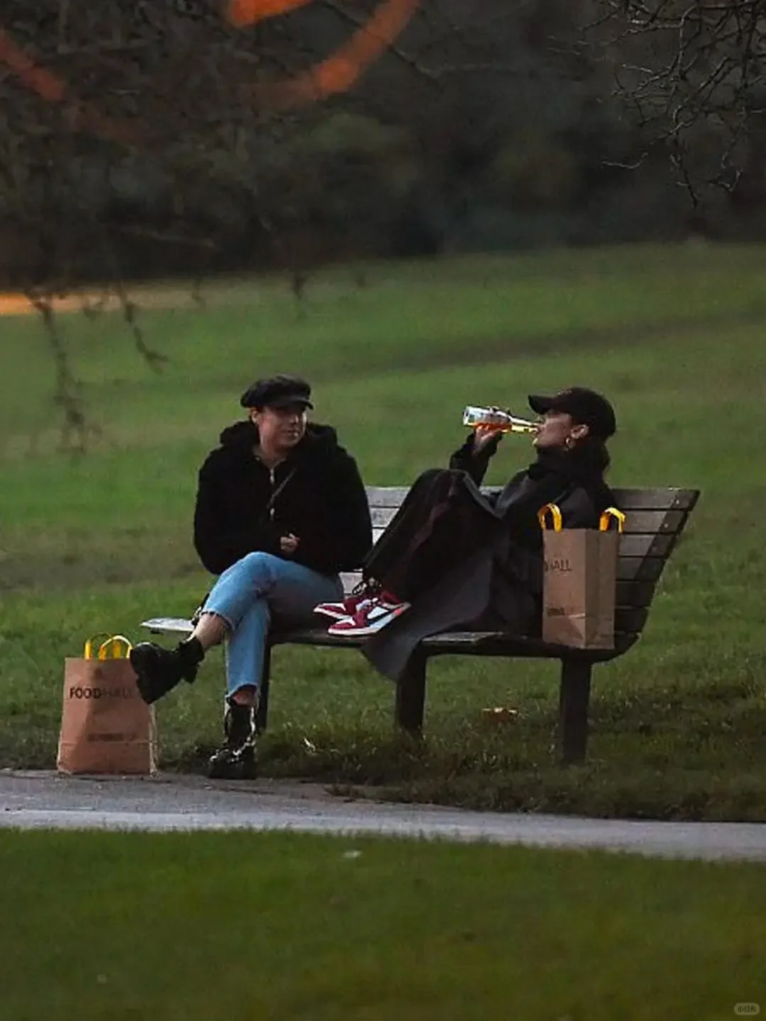 图中,两人惬意地坐在长凳上,贝拉在朋友面前似乎放下了所有防备般的随意地靠在椅背上。