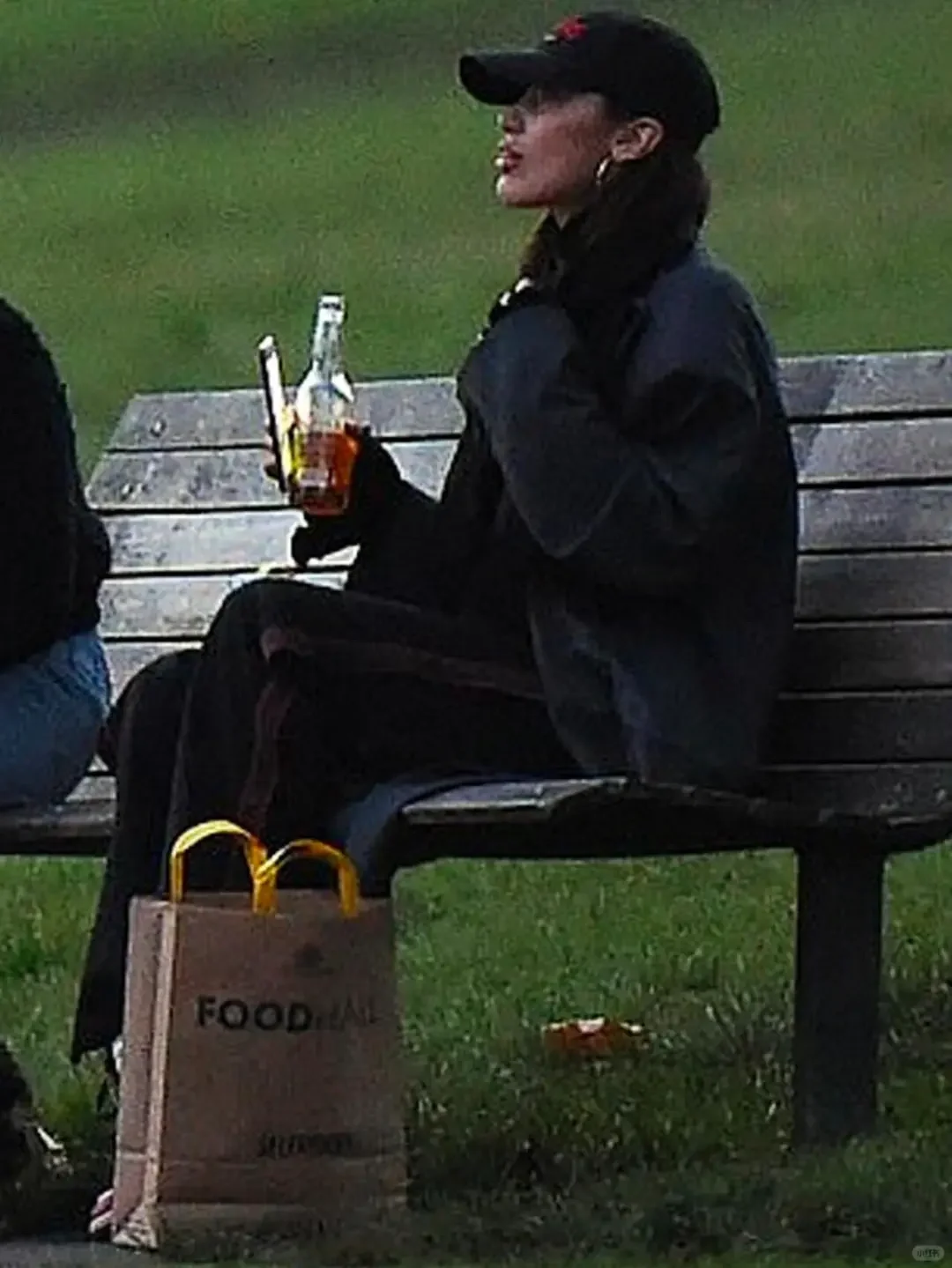 或是整个人缩在长椅上,仰头喝着啤酒,偶尔用嘴咬开一袋零食,看着十分放松。而好友一直面带笑意地望着她。黄昏、公园、啤酒、好友