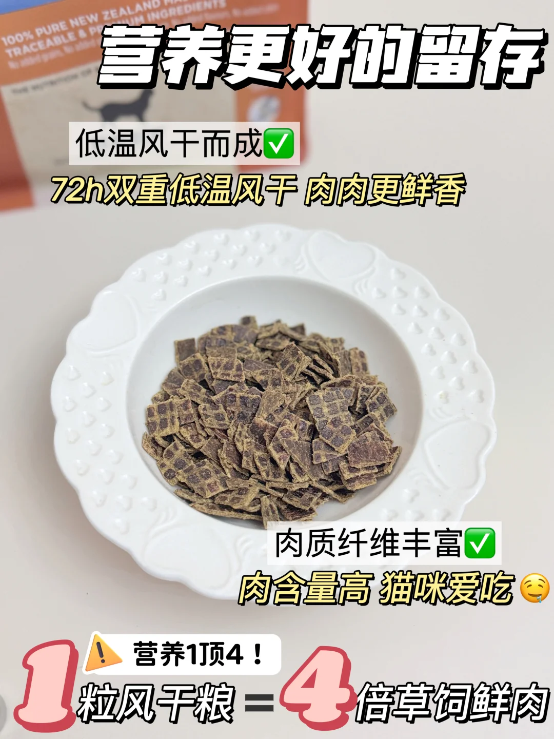 🔍毛利传统风干工艺比较有优势,经过了72小时的双重低温风干,营养和味道都更好的被保留了,一粒风干粮跟4倍鲜肉差不多,这哪个小猫咪会不爱吃呢~