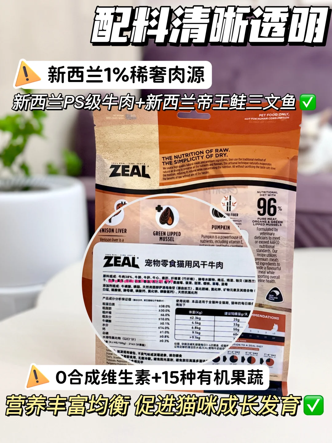🔍我家毛孩子也吃过不少风干粮了,zui让我满意的还得是ZEAL风干粮。它用料可是舍得,草饲的肉源品质更优秀,就连三文鱼都是全球只有1%的帝王鲑,怪不得所有原料都敢100%溯源,这样提供的营养肯定丰富。