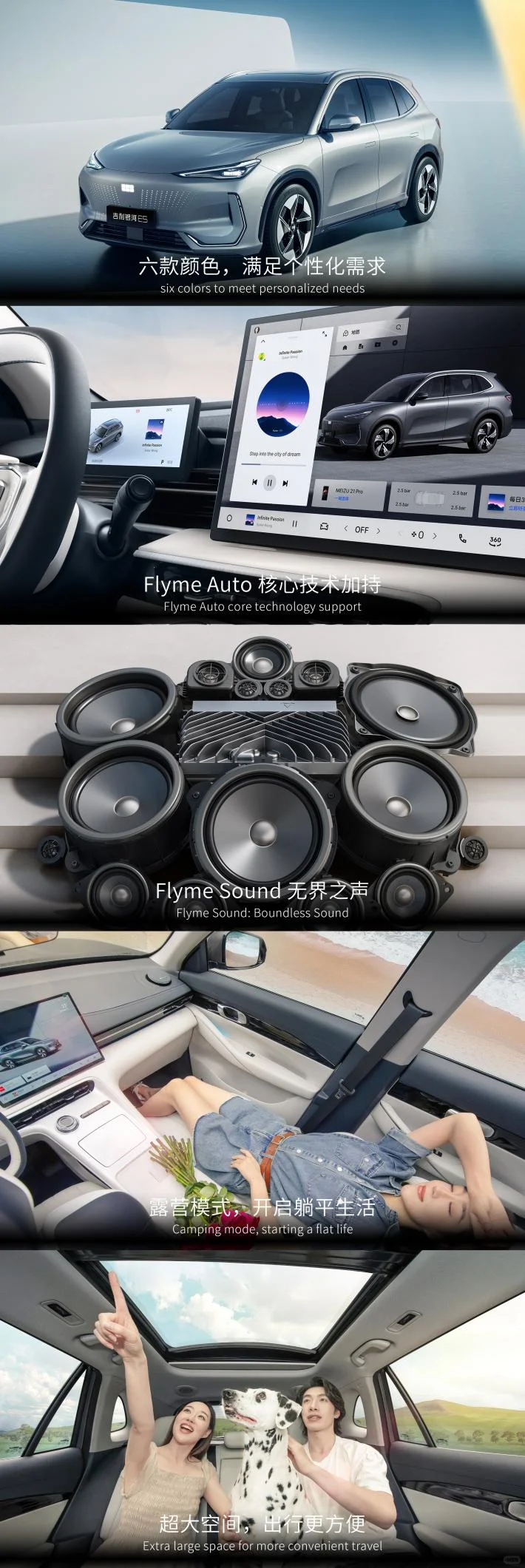 不愧是吉利银河E5,颜值斩男更斩女,6款颜色满足不同的个性化需求,外观吸睛不说,配置同样抗打!