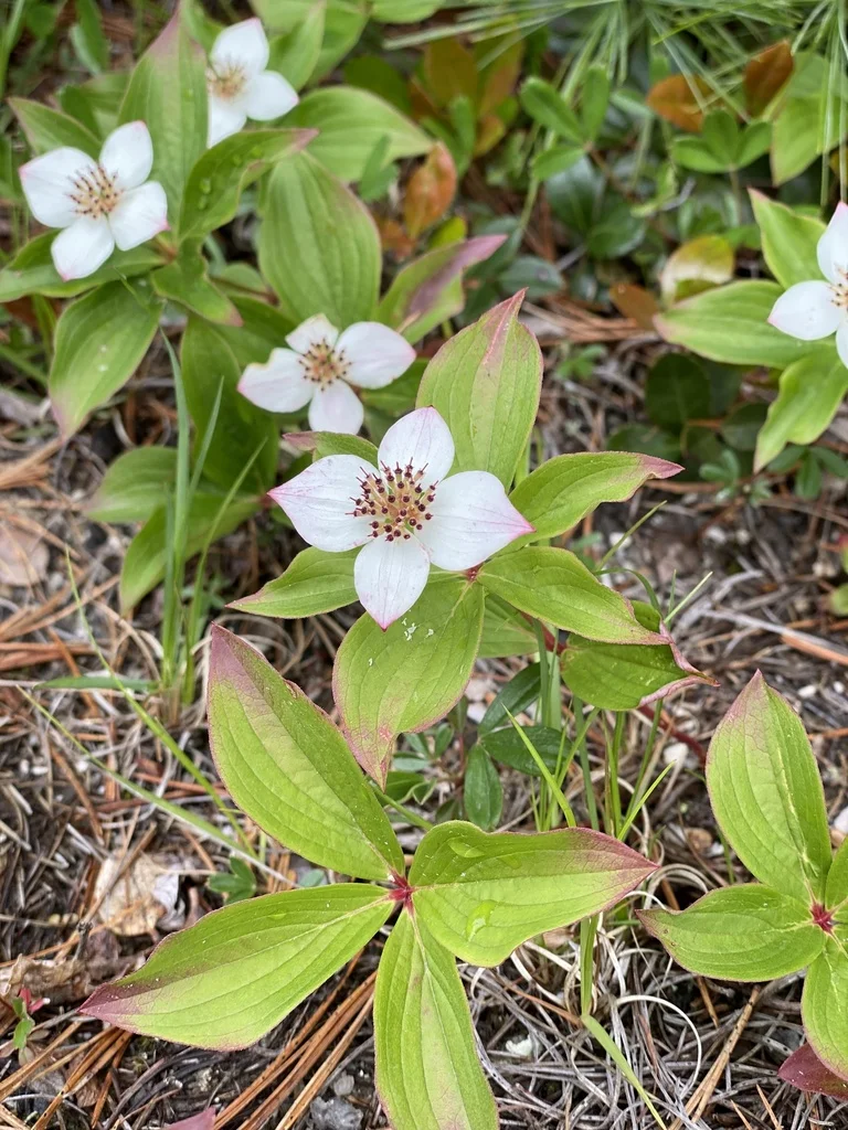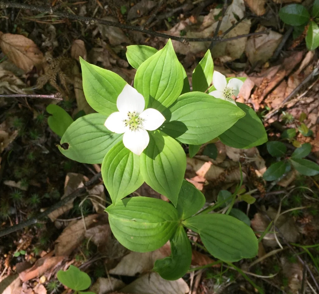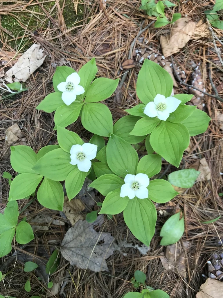 加拿大草茱萸Cornus canadensis 山茱萸科,四照花属 广布于北温带,中国北部的吉林省、朝鲜、日本、俄罗斯远东地区及北美洲都有分布。 这是一种美丽的多年生宿根草本植物,一般可在山地的针叶林内,比较潮湿的树林边缘,又或在老树桩上,长满青苔的地方,潮湿的地方发现,比较稀有。 开出美丽的白色花朵,火红的果实可以食用,味道类似苹果。