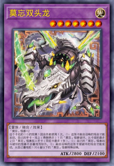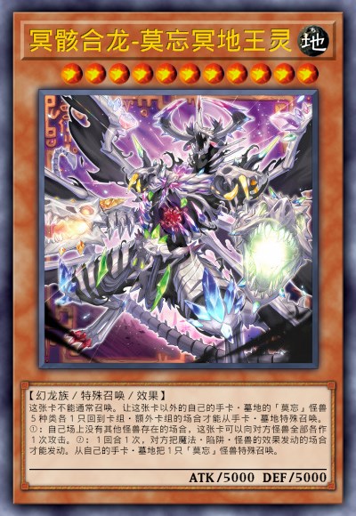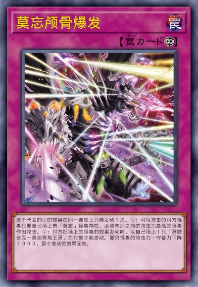 莫忘全家卡都以一个非常简单的逻辑展开即堆墓召唤大哥,这也使得莫忘本家卡都是以辅助大哥为战斗方式,当然既然是大哥当然不会是什么被遗忘的单卡,莫忘冥骸龙以5种莫忘回收特招自己可以对每一只怪兽进行一次攻击,对手发动效果时特招本家怪兽。