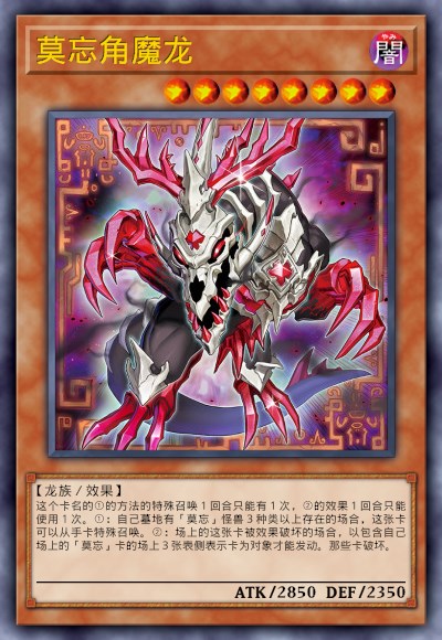 莫忘角龙原型8星三角魔龙,其效果墓地中有3种以上莫忘时特招自己,以及被效果破坏时破坏场上3张卡。