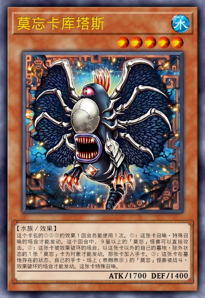 莫忘库塔斯原型5星卡库塔斯,其效果本回合召唤特招成功时本回合9星以上莫忘怪兽可以直接攻击玩家,以及该卡被效果破坏时回收一张除外区或墓地本家和在墓地时场上手牌中莫忘怪兽被战斗效果破坏时特殊召唤自己。