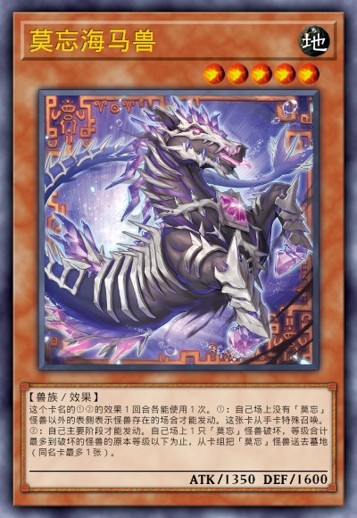 莫忘海马兽原型5星白板海马兽,其效果场上无莫忘以外怪兽存在时特招自己,以及破坏场上一张莫忘怪兽送墓一只破坏怪兽等级以下的怪兽送入墓地。