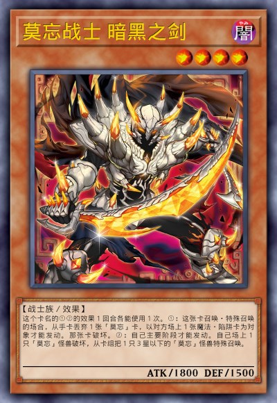 莫忘黑暗之剑原型4星白板黑暗之剑,其效果召唤特招成功时丢手一张本家以对方场上一张魔限卡进行破坏,以及破坏场上一张本家莫忘特招卡组中一张等级3莫忘。