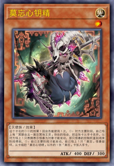 莫忘妖精原型也为1星白板的心钥妖精,其效果是丢手心控对方一只怪兽以及破坏场上一张莫忘本家接着检索一张妖精以外的莫忘怪兽。