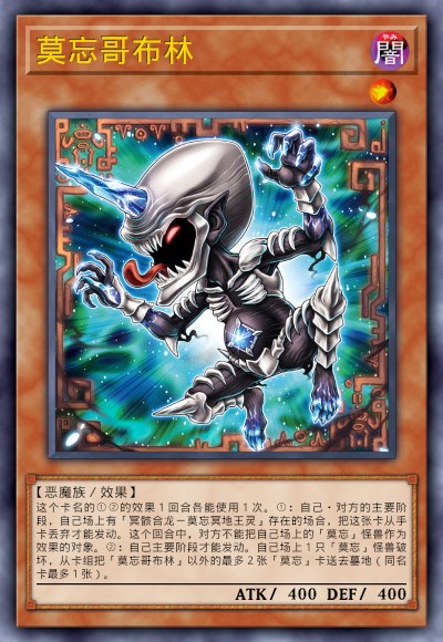 莫忘哥布林原型是1星的白板卡哥布林,在冥界它获得了强化本家大哥和主要回合精堆的效果。